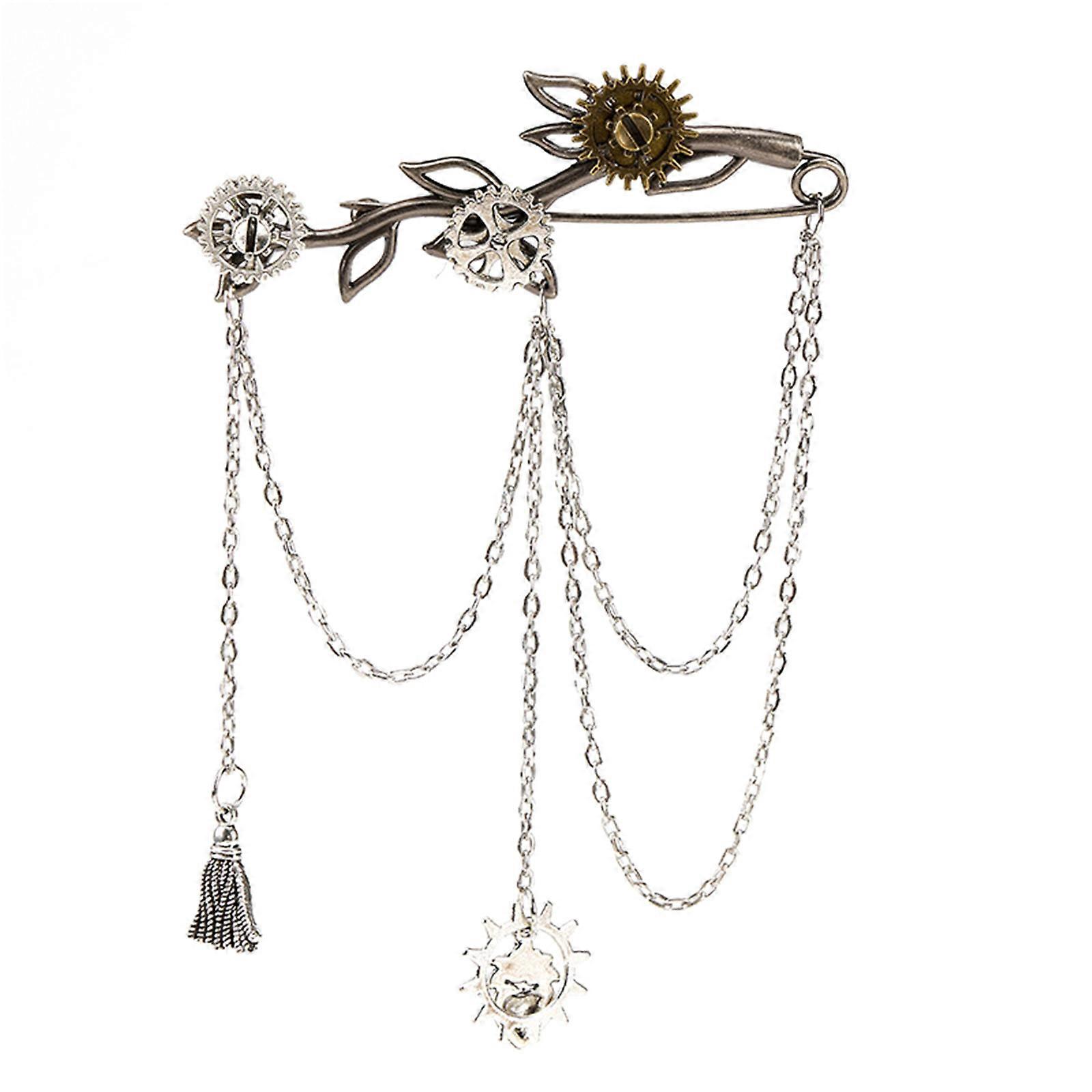 Punk Gear Leaf Brooch Pins for Women Men Punk Lapel Pin Hanging Tassels Chain Brooch Pin Shirt Collar Pins Jewelry Silver