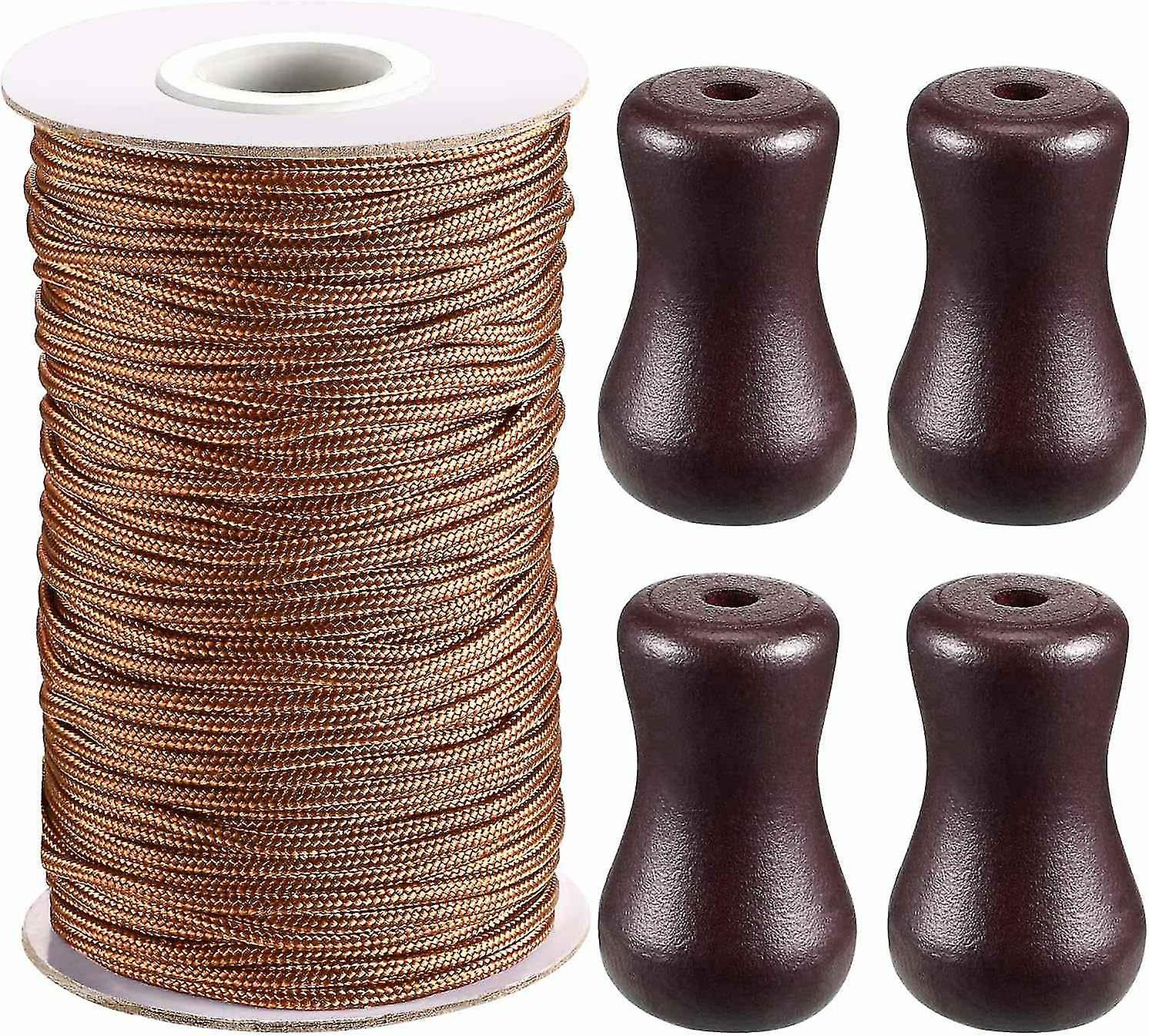 (Brown)1.8mm Brown Braided Shade Rope 55 Yards/Roll with 4 Pieces Brown Wooden Pendant for Aluminum