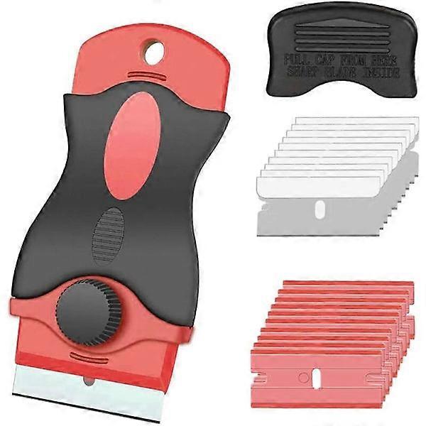 Ceramic Hob Scraper with Soft Grip Handle + 10 Metal Blades & 10 Plastic Blades Perfect for cleaning glass, mirrors, and floors. Features: Complete Set: Includes 1 scraper, 10 plastic safety blades, and 10 stainless steel blades. Automotive Use: Remove vinyl, decals, signs, and adhesive residue from tinted films. Household Use: Remove paint, glue, sealant, or adhesives from glass, tiles, walls, and floors. Comfortable Grip: Non-slip silicone handle for easy and safe use. Durable and Convenient: Fine workmanship, superior quality, and easy to carry. Package Includes: 1 * Mini Scraper, 10 * Metal Blades, 10 * Plastic Blades
