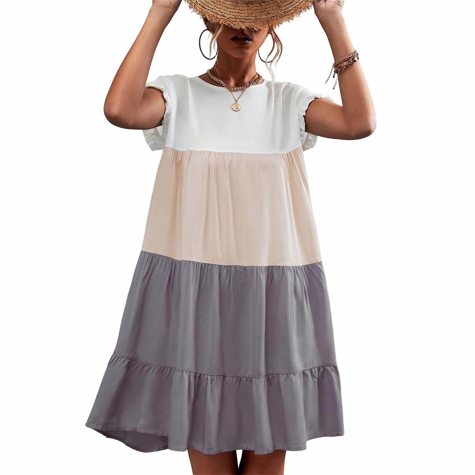 Women's Classic Color Contrast Patchwork Dress Round Neck Ruffle Sleeve Sweet Cake Skirt