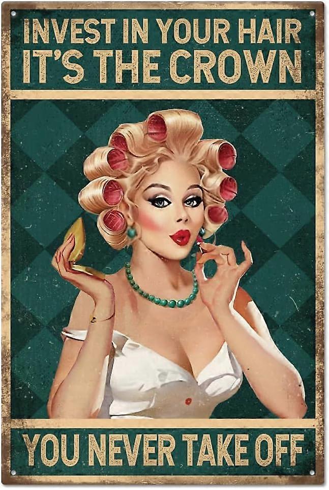 Salon Hairdresser Funny Tin Sign Invest in Your Hair It's The Crown You Never Take Off Barber Shop Charming Lady Hairstyling Vintage Tin Sign for Bars