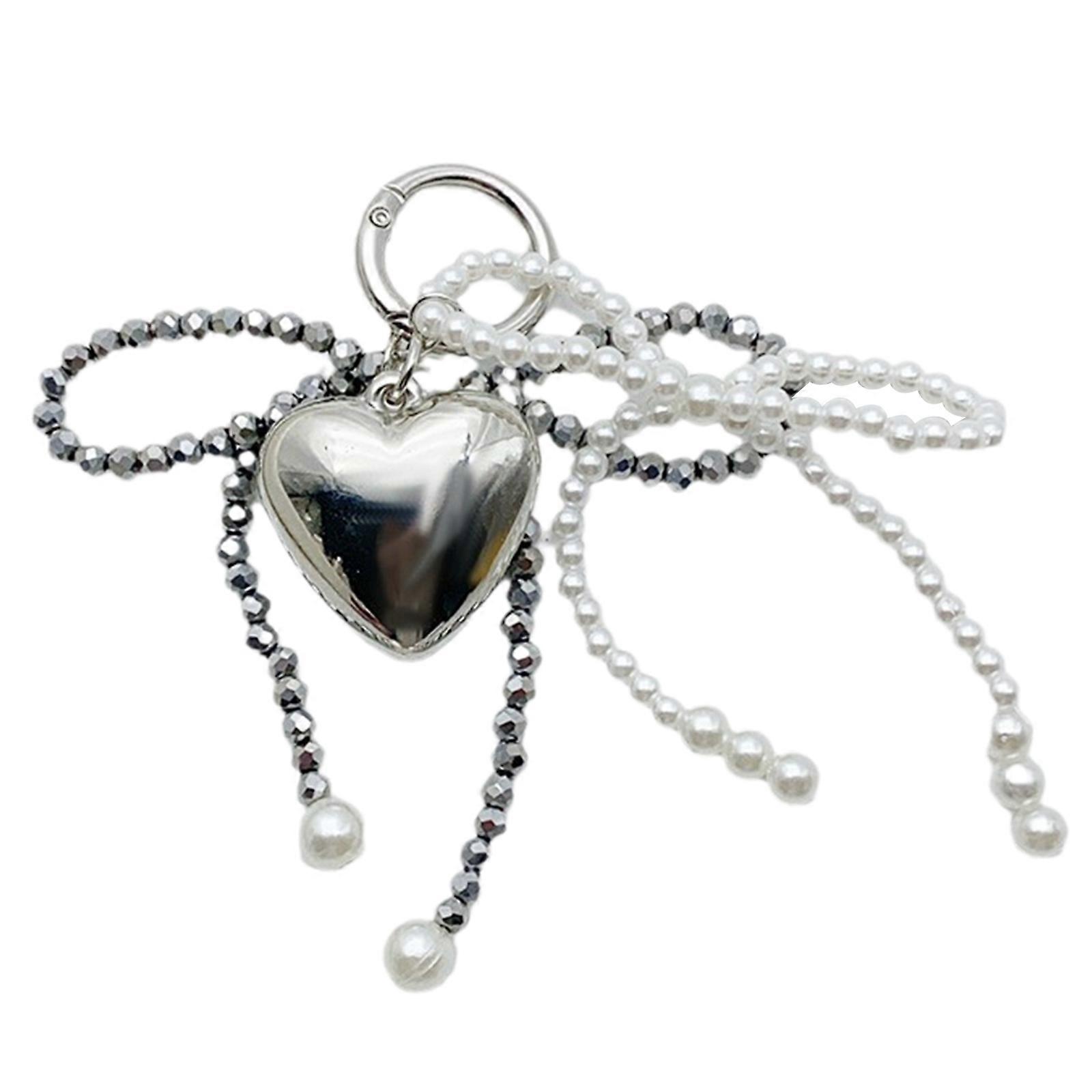 Fashionable Keychain Bead Bowtie Heart Charm Keyring Bag Pendant Elegant Handbag Decoration for Women Ladies Gray