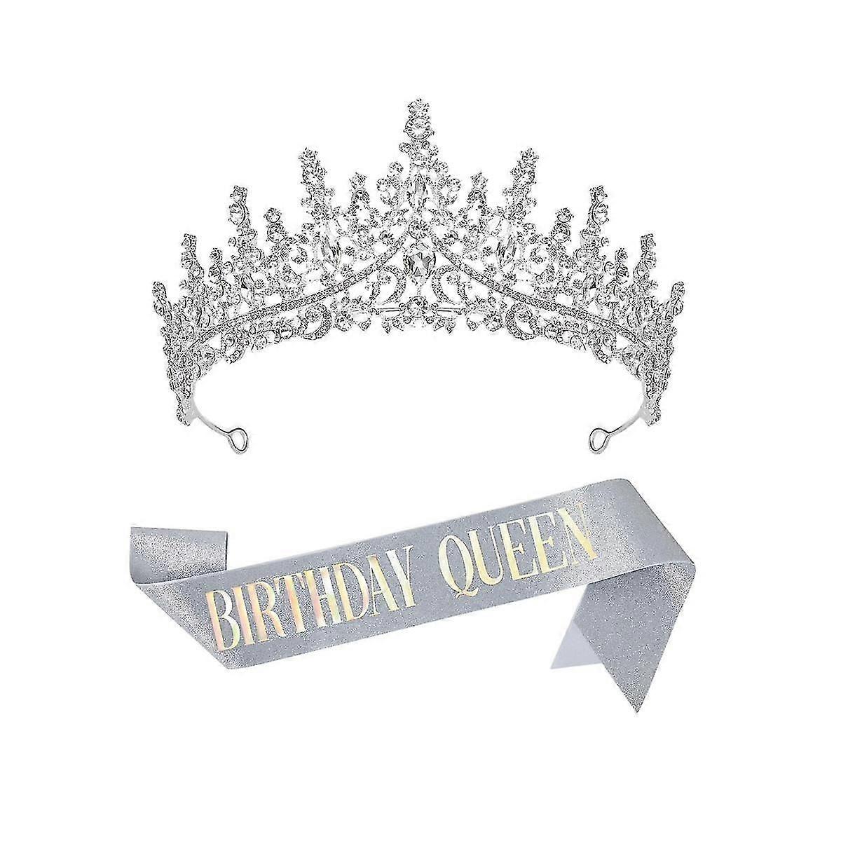 Birthday Crowns for Women Silver Sash and Set Rhinestone Princess Headband for Birth Day Party