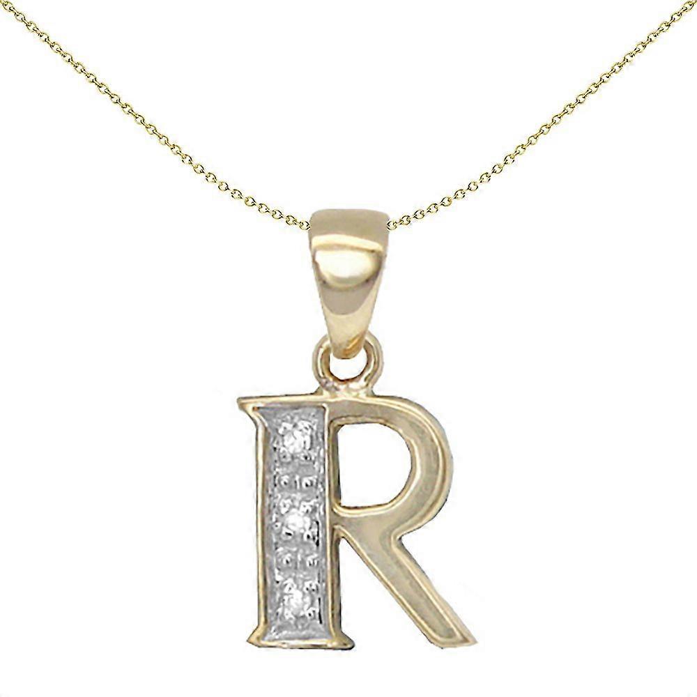 Jewelco London 9ct Yellow Gold Pave Set Round H I2 0.02ct Diamond Identity Dainty Initial ID Charm Pendant Letter R