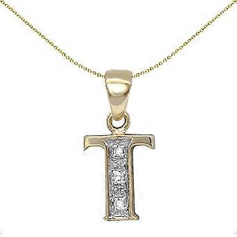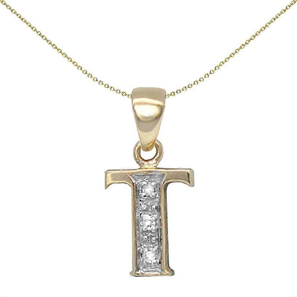 Jewelco London 9ct Yellow Gold Pave Set Round H I2 0.02ct Diamond Identity Dainty Initial ID Charm Pendant Letter T