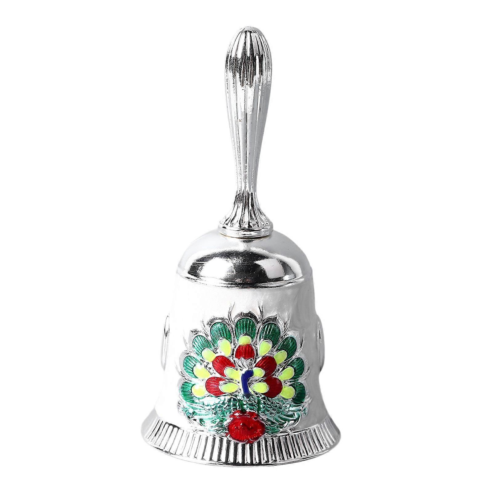 Hand Bell Vintage Brass Antique Exquisite Carved Pattern Hand Call Bell HandBell for Dinner Wedding Party Family School Silver with Colorful White