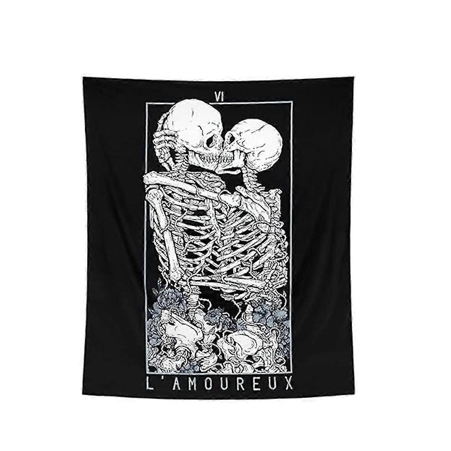 Skull Kissing Lover Black and White Tarot Skeleton Flower Tapestry,L