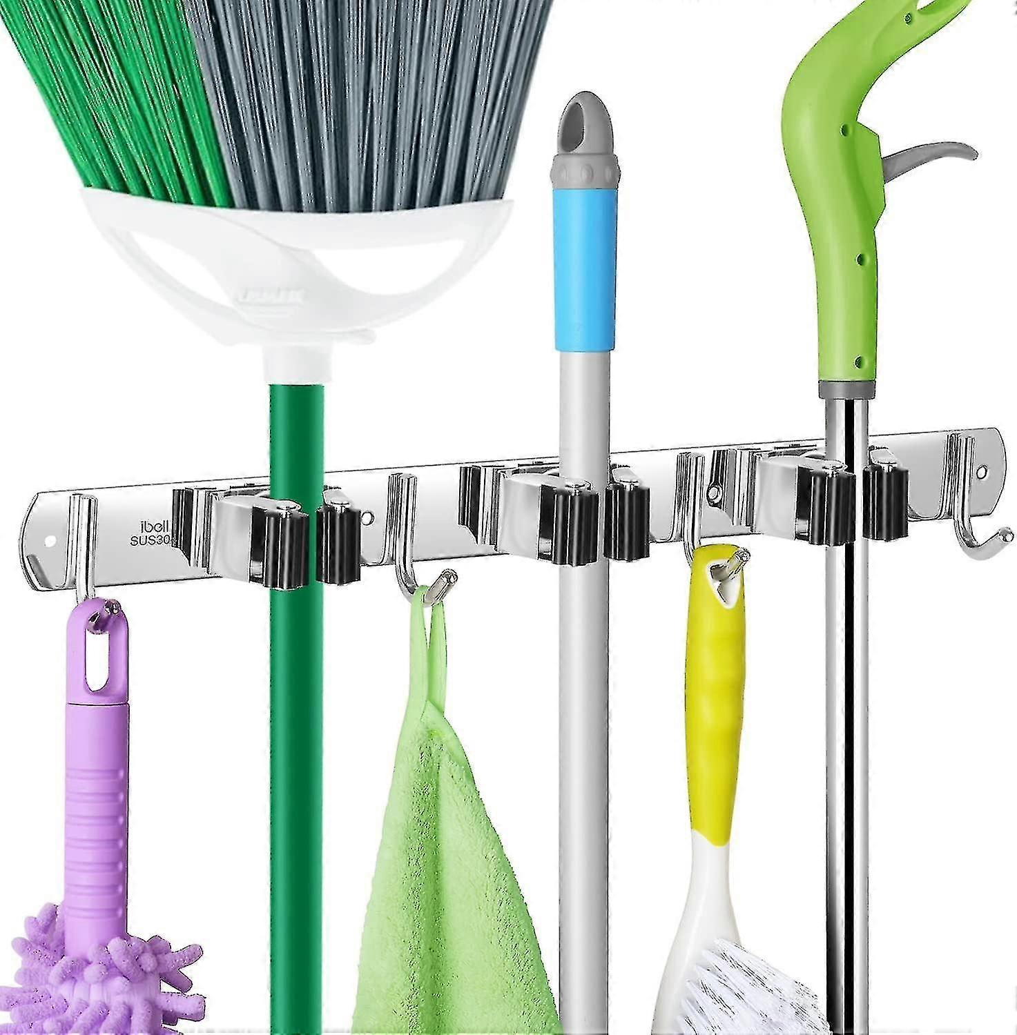Wall Broom Hanger, Stainless Steel Wall Broom Holder, Self Adhesive Storage Hanger Holder With 3 Slots And 4 Hooks For Kitchen Garden Garage