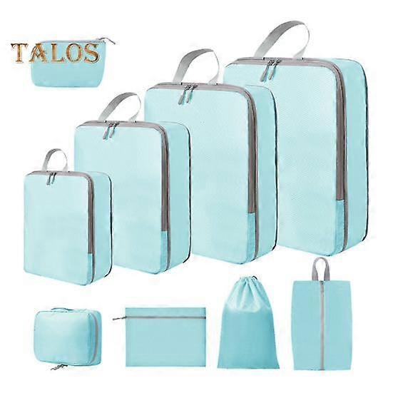 Featuring a 9-pack set with compression zippers, these cubes can compress your clothes into a compact shape, saving up to 60 percent of storage space. They are versatile and can be used in hand luggage, suitcases, backpacks, making them ideal for various travel scenarios including business trips, camping adventures, and vacations.