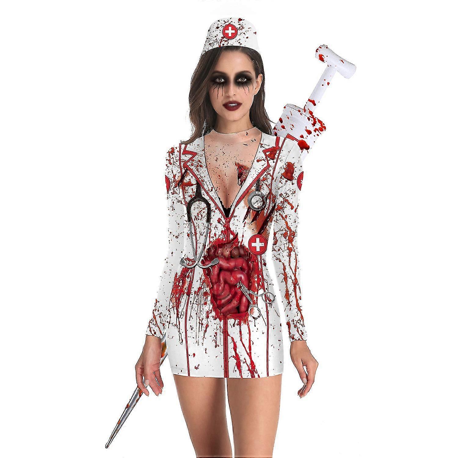 Ladies Halloween Party Horror Costumes Bloody Nurse Zombie Dress Cosplay Sexy Ladies Round Neck Long Sleeve Pack Hip Dress