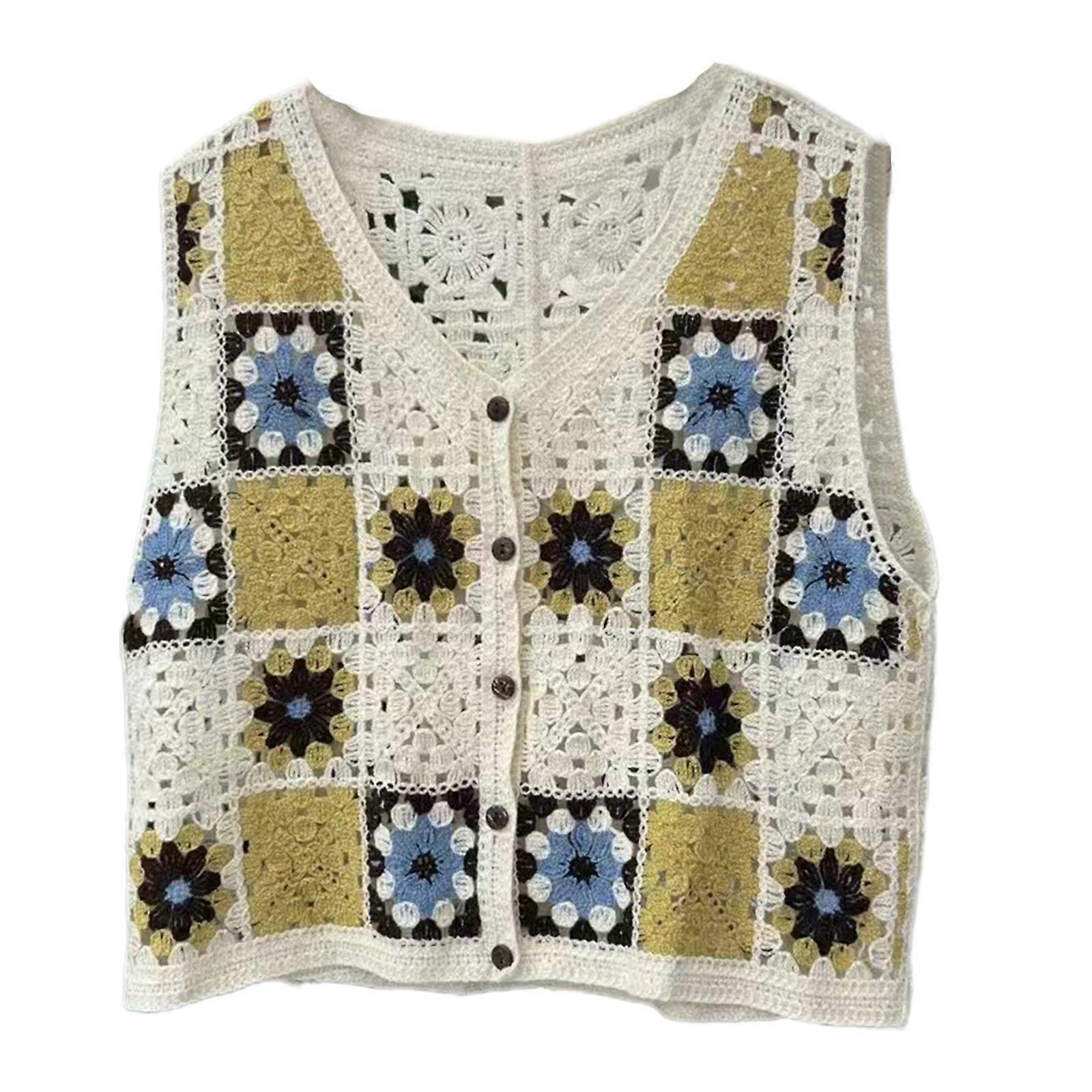 Ladies Hollow Out Cardigan V Neck Button Down Knitted Open Front Sweater Sleeveless Loose Vest Tops Cropped Sweater Coat light yellow