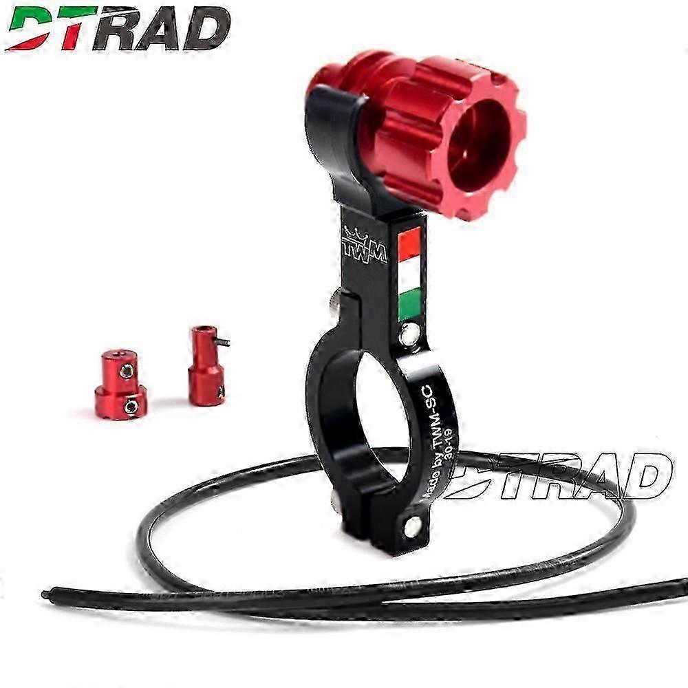 Remote adjusters are devices to allow a rider to adjust their brake lever using their left hand, as opposed to manipulating the master cylinder directly on the right side. This allows racers to adjust their brake levers for brake fade while riding. TWM Remote Adjusters are the perfect compliment for a Brembo, Accossato Radial Master Cylinder or TWM levers. New GP style adjuster as seen on the MotoGP fatory race bikes. The mounting bracket is extremely slim due to the high quality materials used, so that it fits easily between your switch-gear and clutch perch! This kit includes 1 left hand clamp, with colored adjuster, 1 cable and connector. The connector is the same color as the adjuster. Available in black, red colors. The left clamp has an adjustable head, that can be fixed when you have found the position you want it to sit in. The wire is a high quality steel wire which is covered with a 75cm plastic hose covering. Very simple to connect: simply remove the stock span adjuster and affix the TWM Remote Adjuster to the master cylinder. Fits Brembo RCS, 16x16, 16x18, 19x16, 19x18, 19x20, Accassato, and TWM Brake levers.
