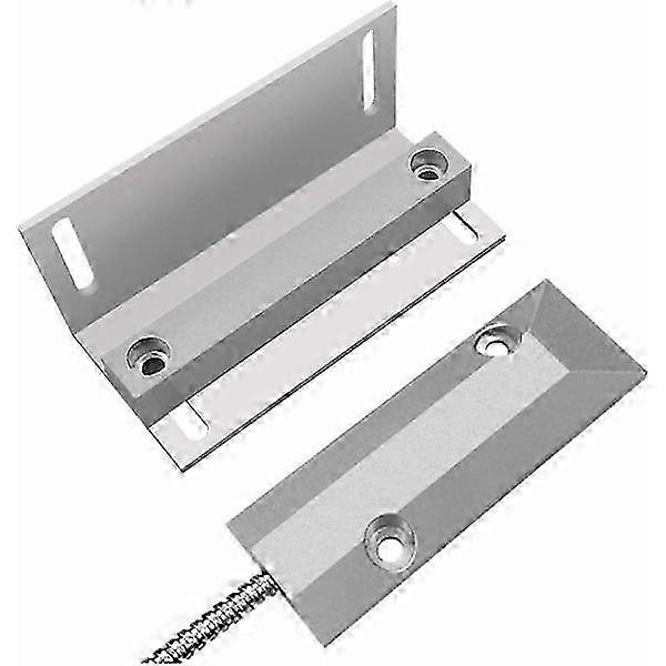 1. Product Name: Heavy Duty Magnetic Roller Shutter Door Contacts 2. Suitable for: Roller Shutter Doors, Garage Doors 3. Mounting Type: Surface Mounted Floor 4. Operating Gap: ≥50mm 5. Connection Type: Wired 6. Cable Length: 380mm armored cable 7. Material: Zinc Alloy Metal 8. Contact Type: NC (Normally Closed) Opens when the magnet is away 9. Max. Voltage Breaking: 28V DC 10. Max. Current: 0.2A 11. Max. Load: 3W