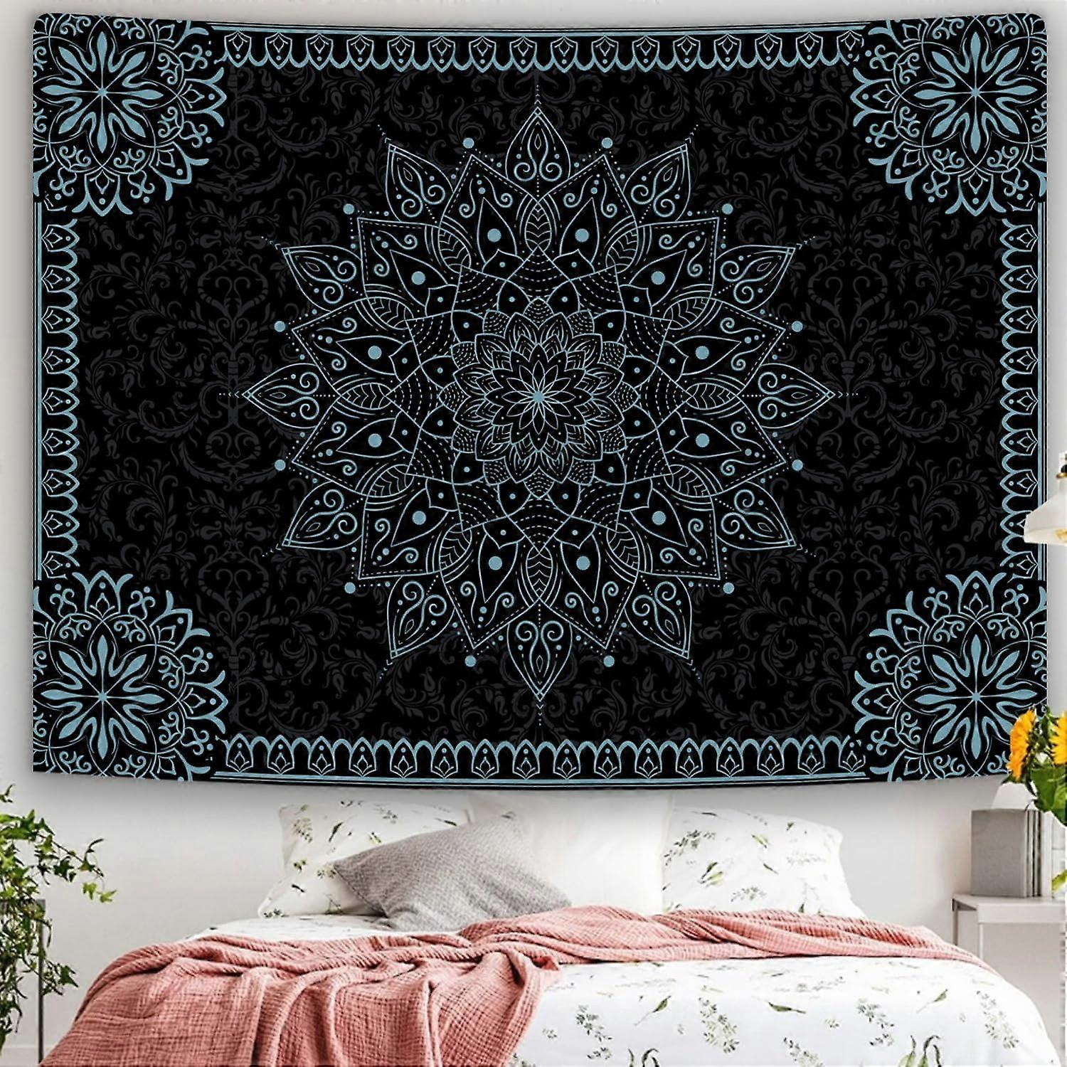 Black Mandala Tapestry, Blue Lotus Flower Bohemian Wall Hanging, Aesthetic Meditation Hippie Indian Boho Wall Art Tapestries Home Decoration for Bedro