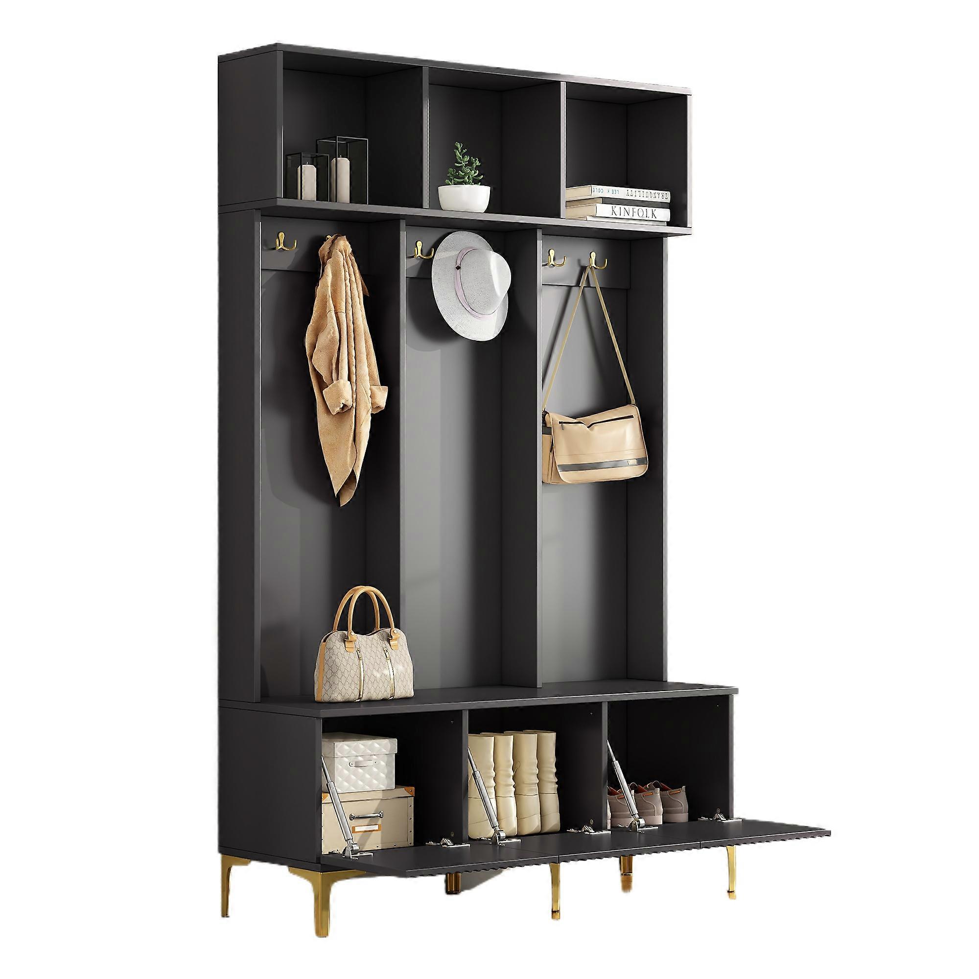 Black Storage Bench 120cm 6 Gold Hooks Open Shelf Hallway