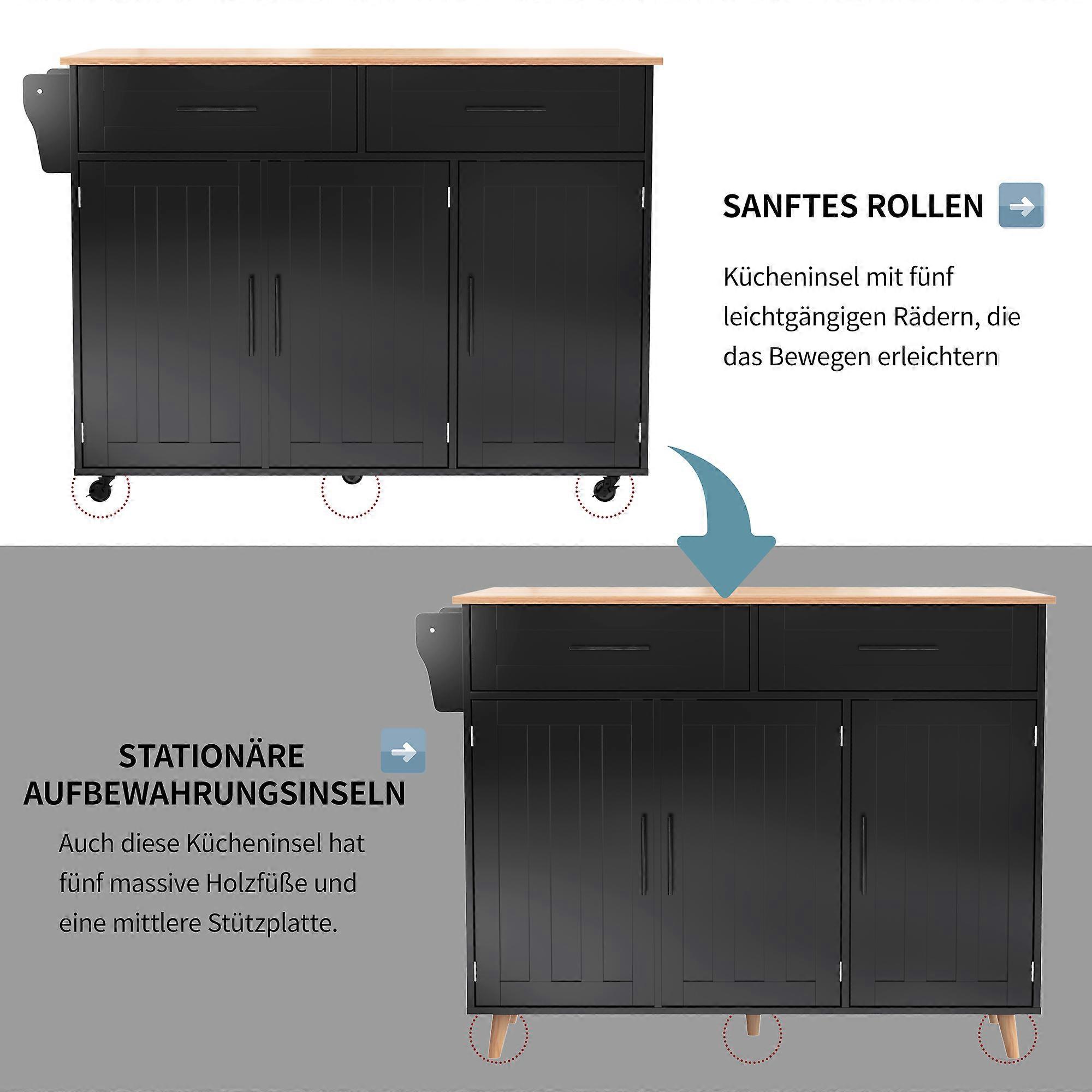 Kitchen Island Cart Folding Table Top 5 Wheels 2 Drawers Black