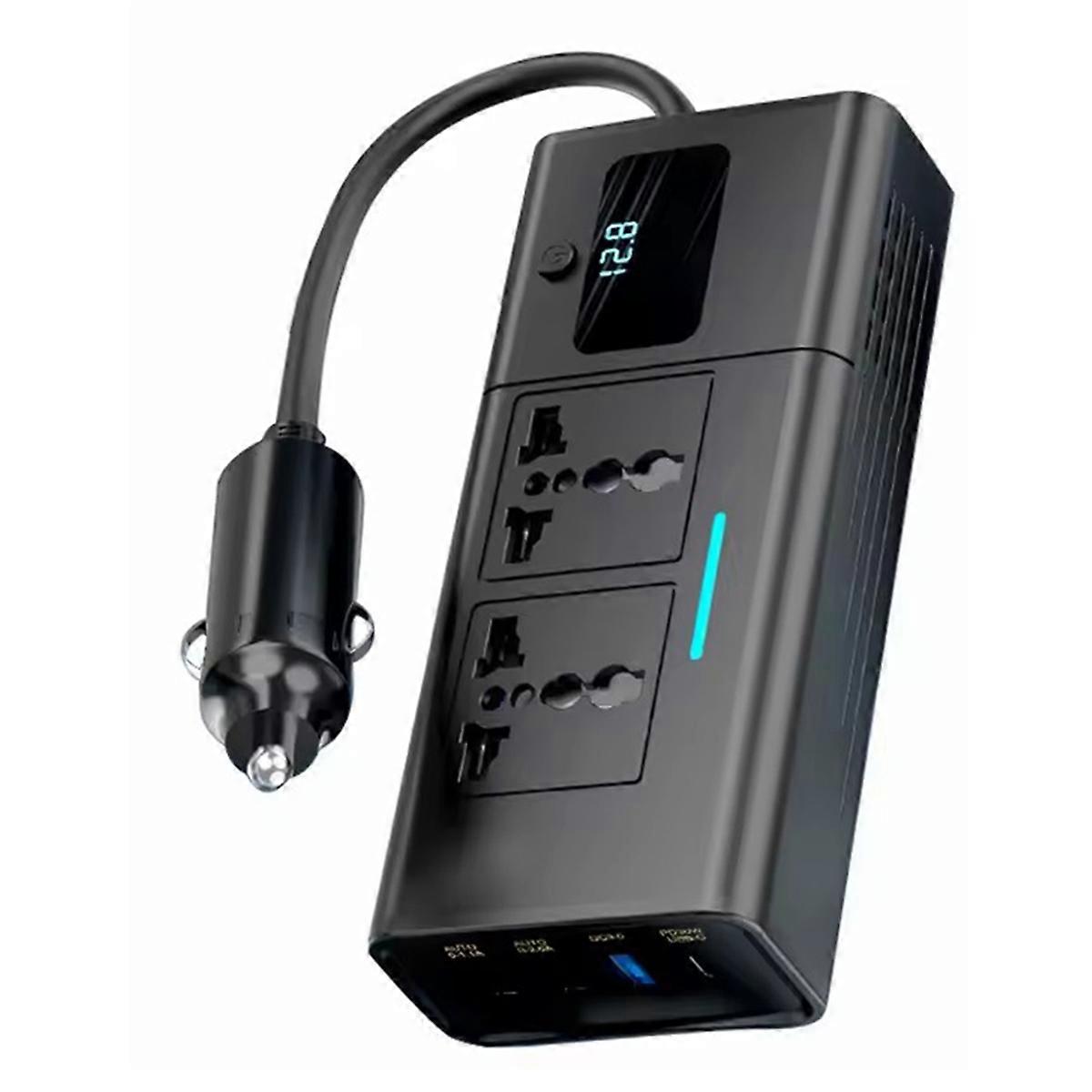 Car Inverter for 200W 200V-240V AC Devices. Suit for 12V Cars. With lighter plug for easy use. AC Power switch, easy to turn off AC device. The device's total rated power is 200W Output sockets: 2 x AC Socket, 1 x 5V/1.1A Type-A USB Port, 1 x 5V/2.0A Type-A USB Port, 1 x QC3.0 18W Type-A USB Port, 1 x PD 30W Type-C USB Port Safety: Input over-voltage protection ( 16V be protected) Output over-load protection ( 230W be protected) Overtemperature protection (85 be protected) Short circuit protection: support When in protect mode, the AC indicator shows orange With cooling fan design, prevent heating for long-time use Length=60cm power cable View the car battery voltage when ACC is on (Engine off status) Support various standard plugs: EU plug/US plug/Aus plug/Japan plug/Korea plug,etc.(Please check the AC plug table on the details page) Attention (Beofre Payment) Do not use it on 24V vehicles. Please check the car fuse for lighter must be no less than 20A before use. Otherwise, the car fuse burn out due to insufficient current. Input Voltage: DC10V-15V AC Output: 200W, AC 220V ( 220V-240V ) 60Hz PD Type-c Output Voltage: DC 5V 3A DC 9V 3A DC 12V 2.5A QC 3.0 Output Voltage: DC 5V 3.4A DC 9V 2A DC 12V 1.5A Color: Black Material: ABS Package Contents: 1 * Car Inverter Only the above package content, other products are not included. Note: Light reflection and different displays may cause the color of the item in the picture a little different from the real thing. The measurement allowed error is +/- 1-3cm.