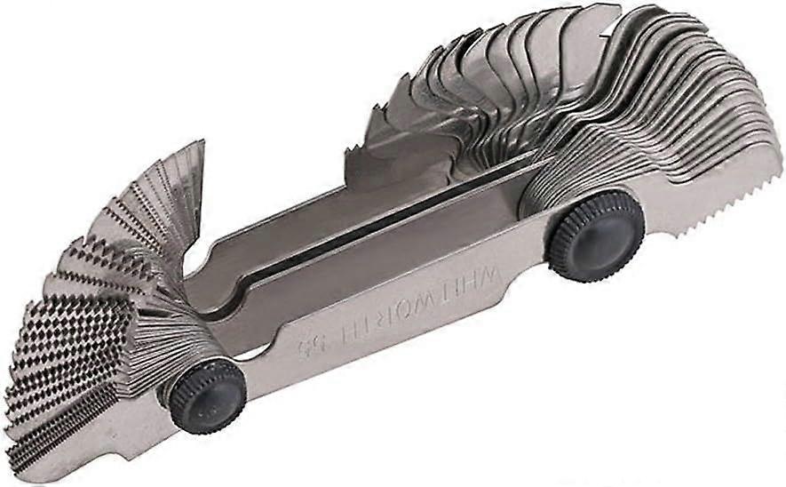 Product Description: Quantity: 1 set Material: stainless steel + chrome finish Dimension: 670 x 20 x 13mm Weight: 0.06 kg Metric: 0.25 / 0.3 / 0.35 / 0.4 / 0.45 / 0.5 / 0.6 / 0.7 / 0.75 / 0.8 / 0.9 / 1.0 / 1.25 / 1.5 / 1.75 / 2.0 / 2.5 / 3.0 / 3.5 / 4.0 / 4.5 / 5.0 / 5.5 / 6.0 Inches: 4G/4.5G/5G/6G/7G/8G/9G/10G/11G/12G/13G/14G/16G/18G/19G/20G/22G/24G/25G/26G/28G/30G/32G/36G/40G / 48G / 60G / 62G SPECIFICATION - - Metric Thread Pitch Gauge (mm) 60, 24 Pcs. Whitworth - 55, 28 pcs center gag blades. Length: 670mm APPLICATION - - Suitable for the automotive and engineering industry, this thread gauge helps you quickly identify the type of thread being used therefore the correct die or tap ACCURATE MEASUREMENTS - - Each gauge is clearly marked for easy reading of measurements MATERIAL - - This thread gauge is made of stainless steel and finished in chrome. These materials provide high strength EASY TO USE - - It's a thread gauge you can take anywhere. Its light weight and small size allow you