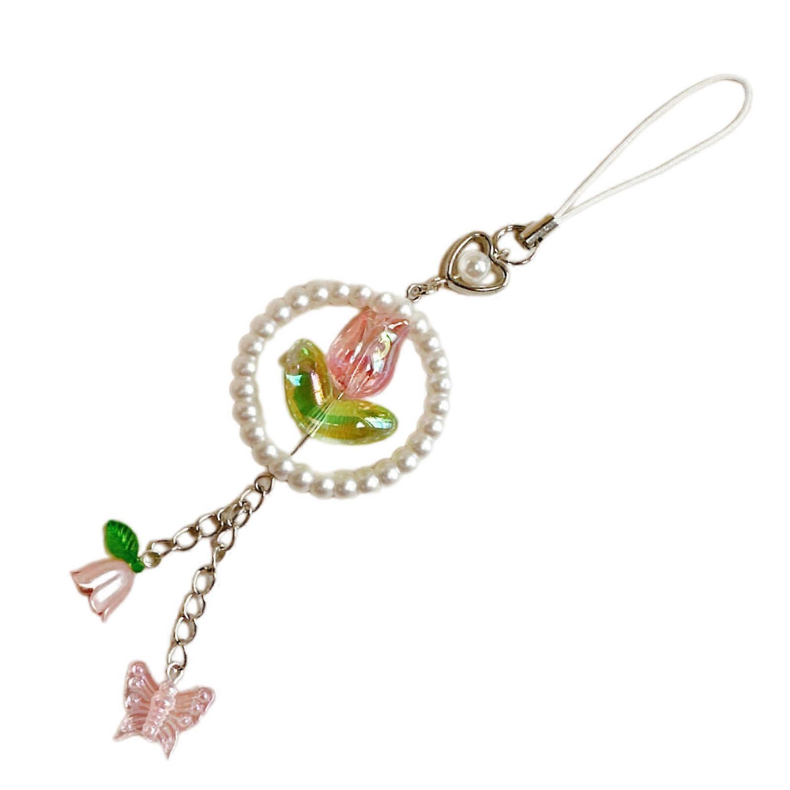 Fashion Flower Butterfly Bead Charm Keychains Pendant Sweet Hanging Ornament Keyring Backpack Decoration for Women Girl Pink