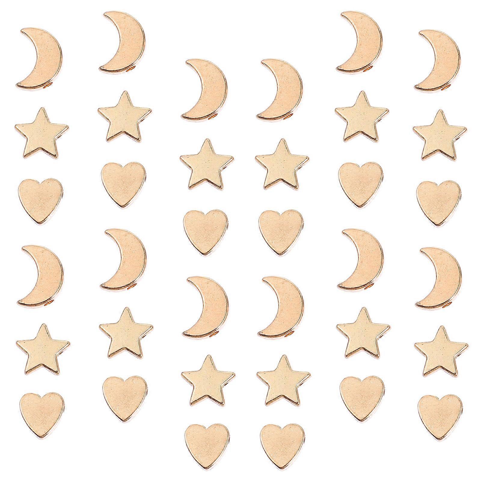 These are DIY beads which are manufactured for DIY crafts. Beautiful beads look great at any event and make perfect handcrafts for home decoration. Each bead has a hole in the center to fit a string through it to make the most necklace or bracelet gift accessory. Features - Material: Alloy - Selected alloy material, which is not easy to deform or break. - You can attach these smooth loose beads can be to hooks, jump rings, strings. - Different styles and sufficient quantities are enough for you to choose and match. - Lightweight and not easy to fade, friendly to your skin and capable of providing long term service in daily life. - These spacer beads for DIY for different kinds of handicraft, such as necklaces, bracelets, pendants. Package list: Moon Shaped Spacer Beads Heart Shaped Spacer Beads Star Shaped Spacer Beads