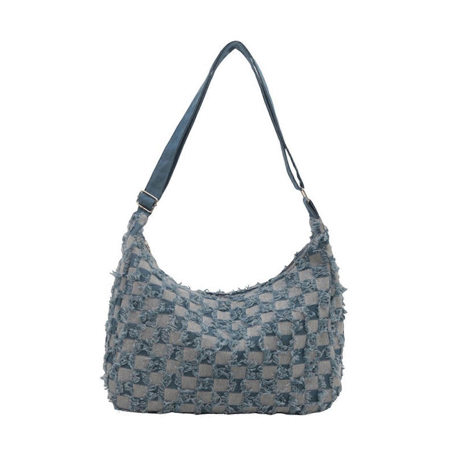 Fashionable Denims Checkered Tassels Shoulder Bag for Women Large Capacity Jeans Distressed Zippered Crossbody Handbag light blue
