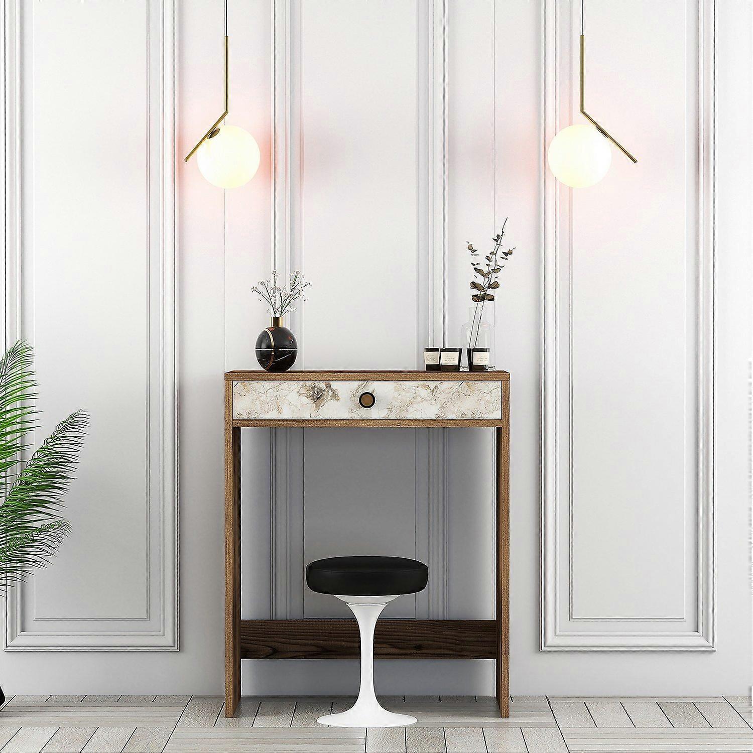 Med en fängslande blandning av valnöts-, vit- och marmorfärger, kompletterar vårt sminkbord utan ansträngning all inredning. Den harmoniska kombinationen av dessa nyanser skapar en visuellt fantastisk pjäs som kommer att bli mittpunkten i ditt rum. Oavsett om din stil är modern, klassisk eller eklektisk, kommer detta bord att integreras sömlöst i ditt utrymme och förstärka dess övergripande estetik.
