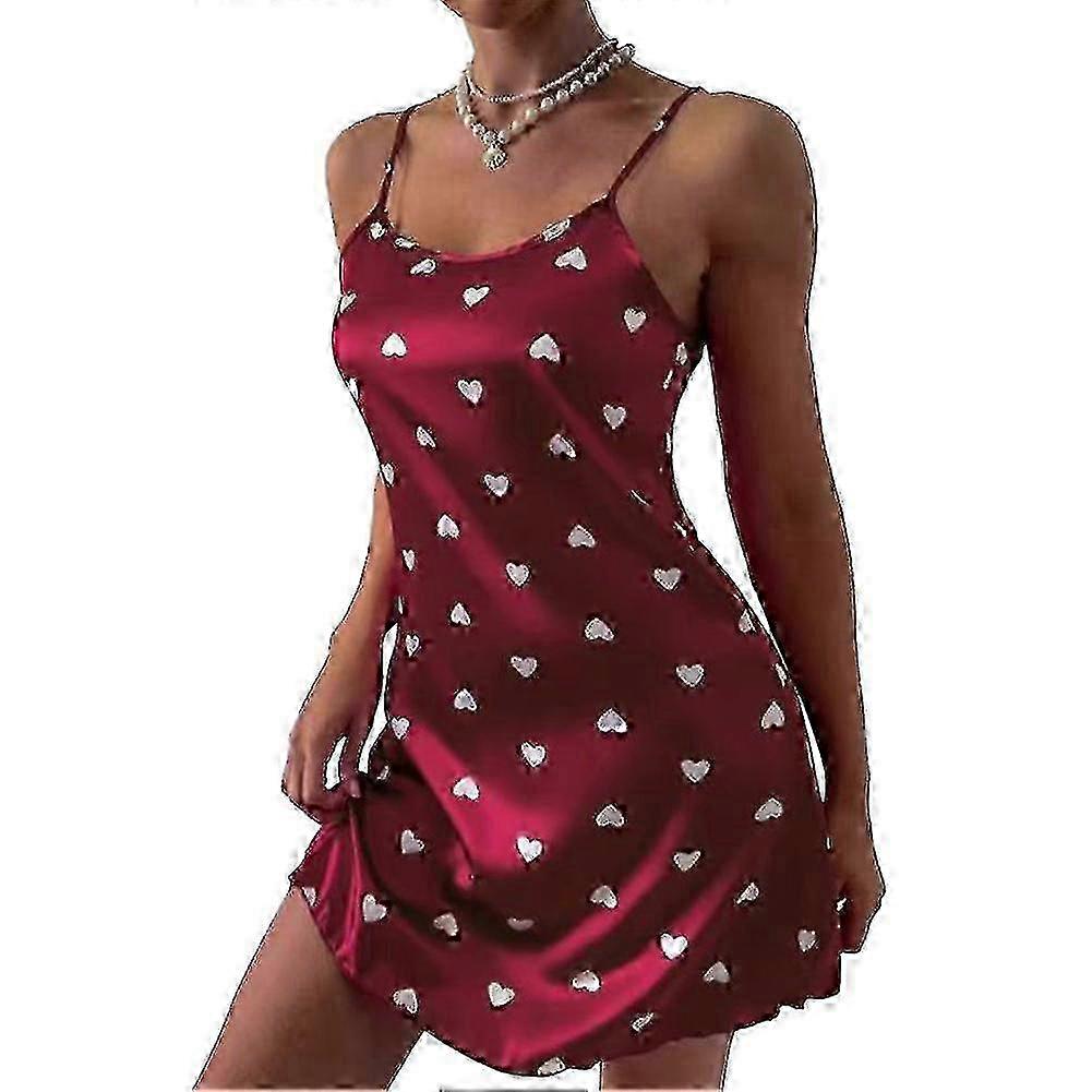 New Women's Sleepwear Satin Nightgown Silk Nighty Sleeveless Nightwear Chemise Heart Print
