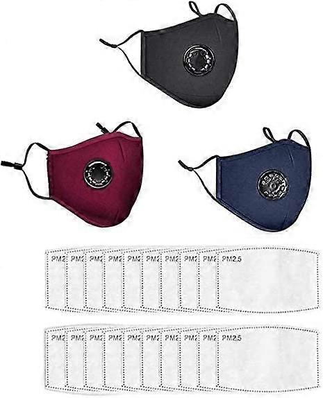 [New Version with 4 Layer] 3Pcs Safety Cotton Face Mask with Breathing Valve Plush Replaceable Activated 20Pcs Carbon Filters | Face Covering Washable