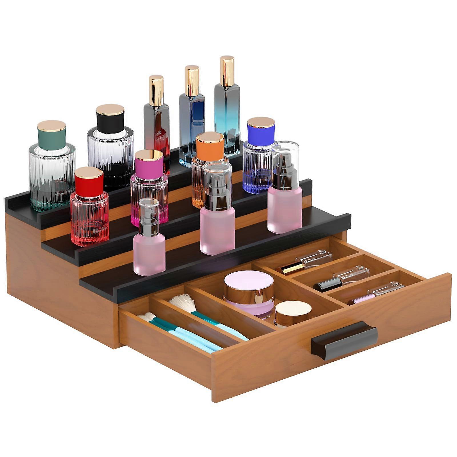 Wooden 3 Tier Perfume Organizer with Hidden Storage, Vintage Brown and Black Cologne Display Rack for Vanity