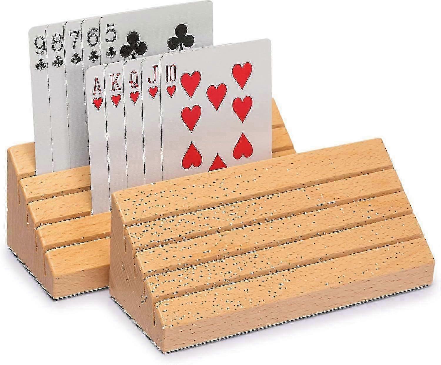 Stay Organized: Standard-sized racks with enough room to build a winning hand; each row is a little higher than the previous one, for easier vision; holds up to 40 cards. Easy and Painless Grip: save your hands from carpal tunnel pain, for your best improved performance Perfect For Children and Seniors: perfect for small hands and those with arthritis problems . Solid Wooden Design: set of 2 solid oak playing card holders measuring 15 x 8 x 6 centimeters each. Protect Your Table: the felted underside helps protect your playing surfaces.