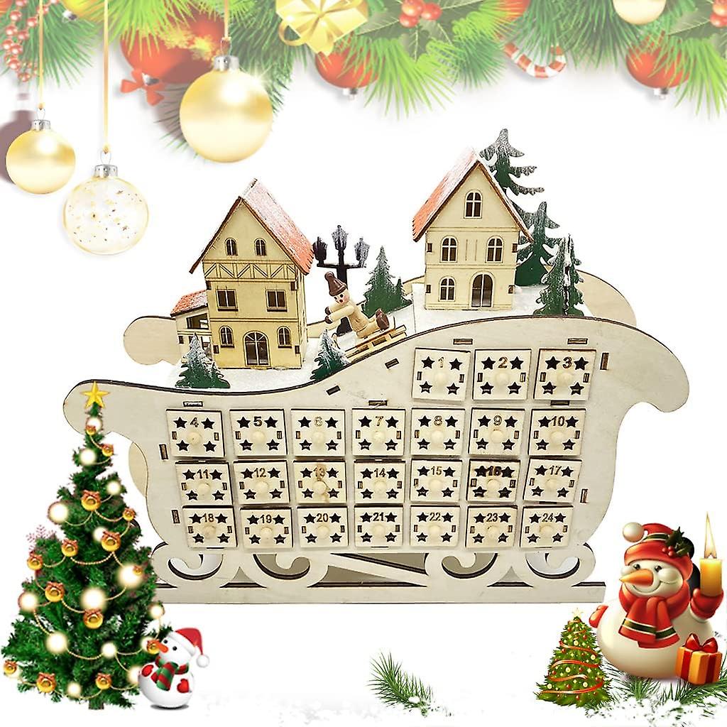 Wooden Advent Calendar Santa Sleigh with LED Light Village House 24 Days