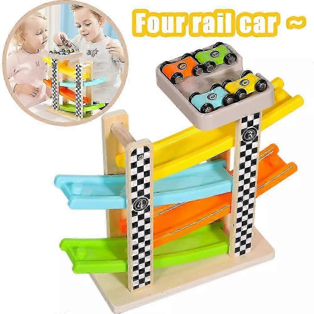 Product UNIQUE TOP PARCKING LOT: 4 bright ramp racer set off from the top parking lot and then slides down the rainbow toddler race track, bringing the toddlers pleasure of racing and improving visuals tracking ability. When the game stops, the toddlers can collect the cars in the top parking lot by themselves, improving your 1/2 year old boy and girls sense of storage, and prevent the cars from getting lost TODDLER FESTIVAL GIFT: The only piece need to be attached is the removable top parking lot, other no assemble needed. This toddler race track toy is compact and sturdy, can be easily stored on shelving or in small room. Suitable for toddler playing at home indoor or outdoor activity, best gift for boy and girl's birthday LEARNING THROUGH PLAYINGThis toddler race track is a simple and well-built toy. Which will encourage the development of your toddler's hand-eye coordination and attention span. Also, encourages toddlers to cooperate and take turns to play their own race cars on the toddler race track, develop communication skills. For the smallest children such as a 1/2 year old boy and girl , they learn dexterity and repetition through playing. They will love this gift and play with parents or friends for hour UNIQUE DESIGN FOR TODDLERS: This wooden car ramp toy is deigned for kids, the width of car ramp to allow only 1 toy car to run through. No more suitable gift for one year old boy. Toddler's safety and your satisfaction are our main concern Specifications Package Include4pcs* Race Track Car+1pc*Parking Lot Note: Due to different personal measurement methods, there will be an error of 2-4 cm, please understand Thanks for your support
