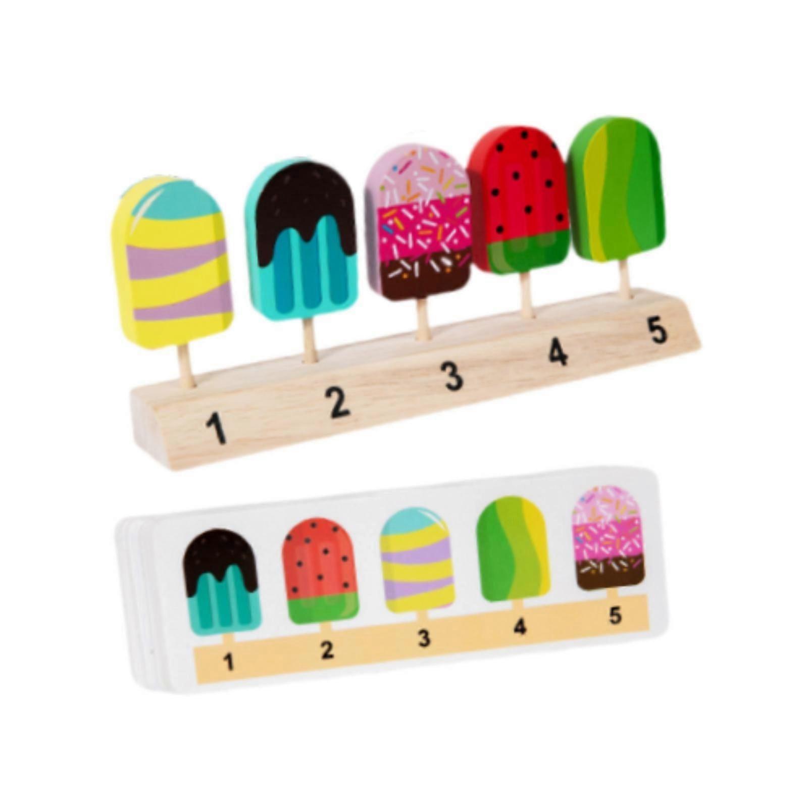 Description: Interactive Learning Experience: This wooden playset is designed for children aged 36 months and above, featuring 20 cards with 40 reference images to help develop hand eye coordination in a fun and engaging wayCognitive Development: Encourage cognitive pairing skills and creativity in your child as they match the sticks to the images, fostering early problem solving abilities Materials: Pretend play food crafted from wood, this toy set is sturdy for long term useComprehensive Set: The package includes a wooden base , 5 ice cream toys , and 20 cards, providing everything needed for hours of imaginative play Gift for Kids: Ideal for parent child interaction and role playing activities, this learning toy set makes an gift that combines fun with educational , promoting logical thinking through playful exploration Specification: Material: Wooden Size Chart: Wooden Stand:21.7cmx4cmx9cm/8.54inchx1.57inchx3.54inchCard:14.2cmx5cm/5.59inchx1.97inch Package Includes: 1 Wooden Base5 Ice Cream Toys20 Cards Note: Please allow 1-3mm measuring deviation due to manual measurement.Due to the different and light effect,the actual color of the item might be slightly different from the color showed on the pictures.Thank you!