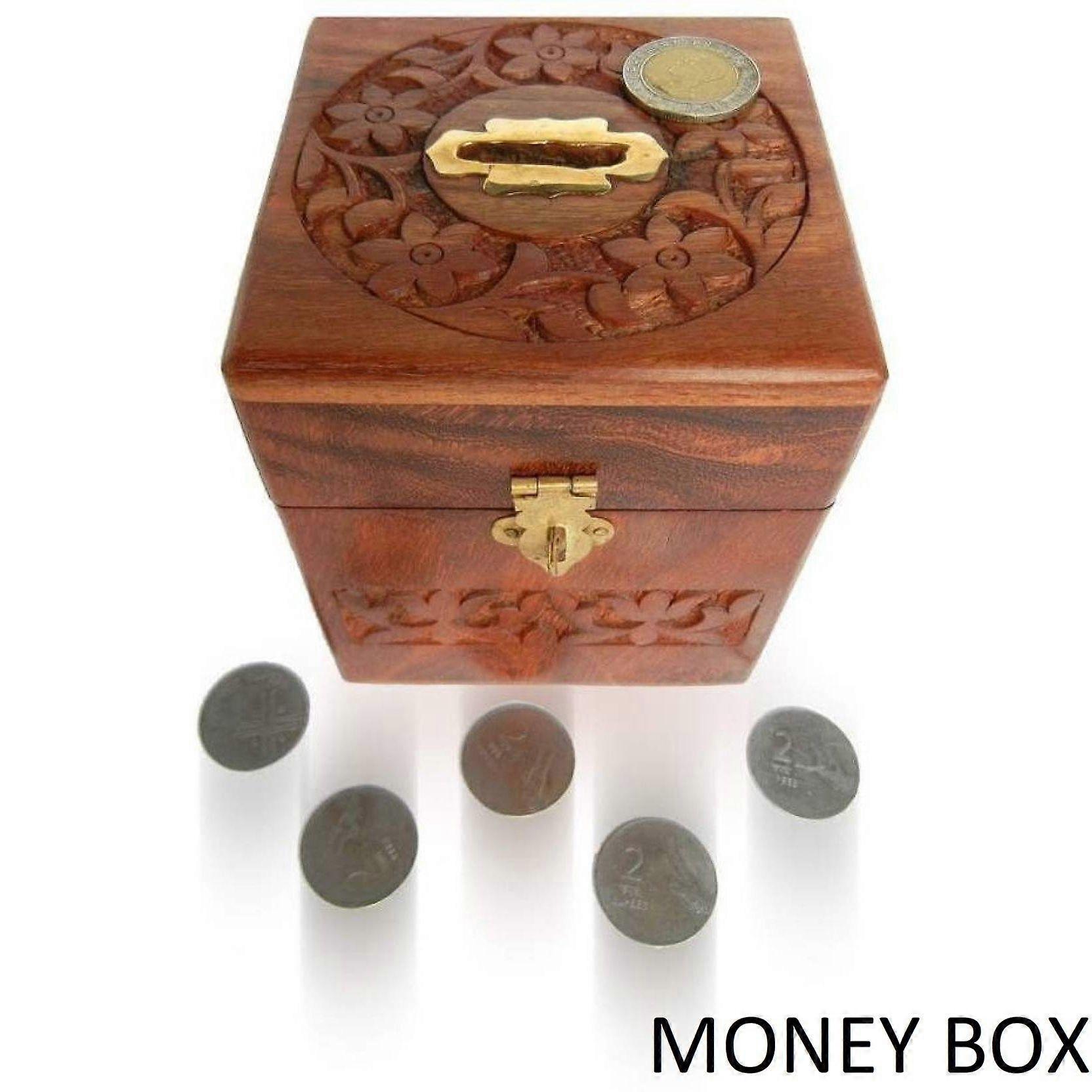 Wooden MONEY BOX Square Carved Handicraft Gift Item Coin Bank (Brown)