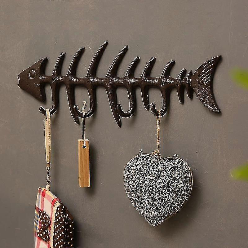 Decorative Fishbone Wall Mount Towel Rack Stylish Cast Iron Hanger With 4" Fish Hook Rust Brown XH