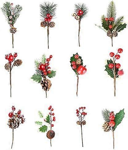 12 Pack Artificial Christmas Pine Picks, Assorted Floral Picks Red Berry Pinecone Stem Faux Tree Picks for Christmas Wreath Festive Winter Season Deco