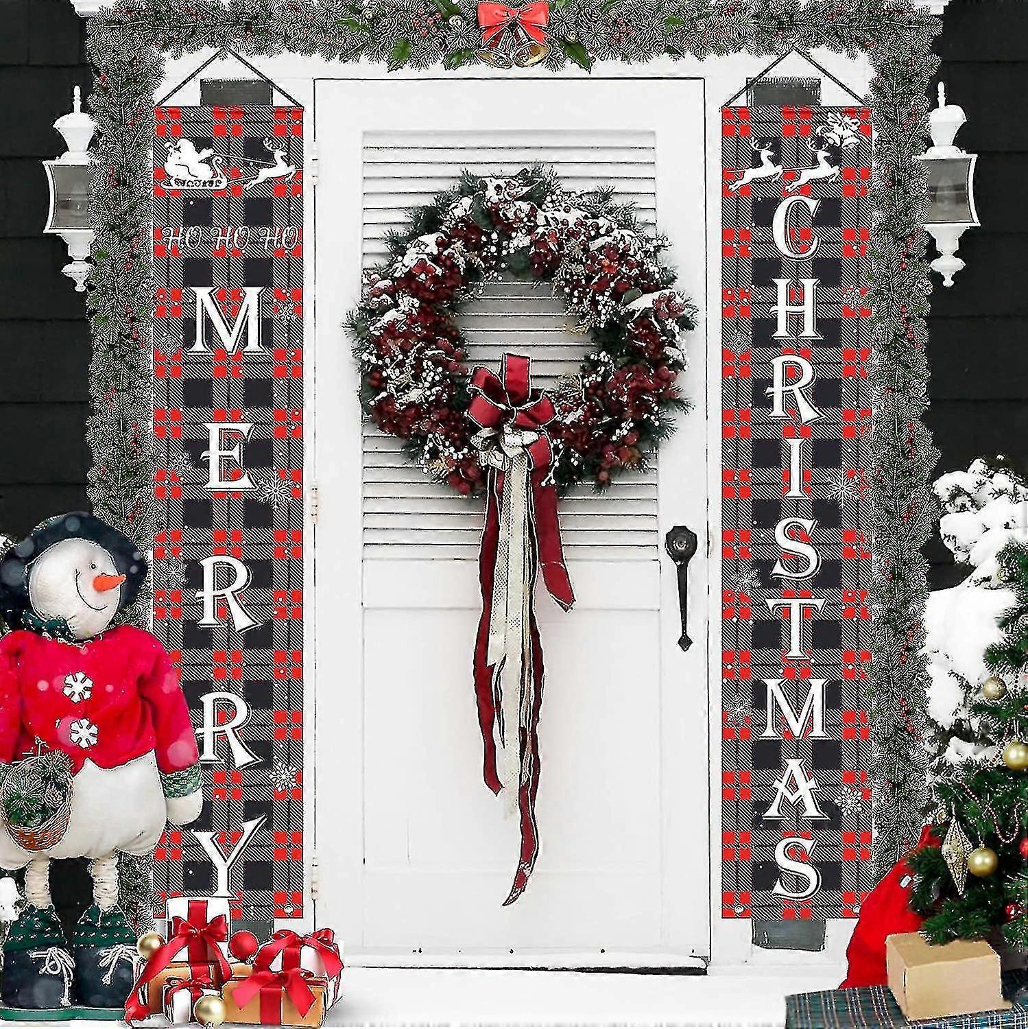 Merry Christmas Decorations Banner, Christmas Porch Sign Red Plaid Hanging Banners For Indoor Outdoor Front Door Wal