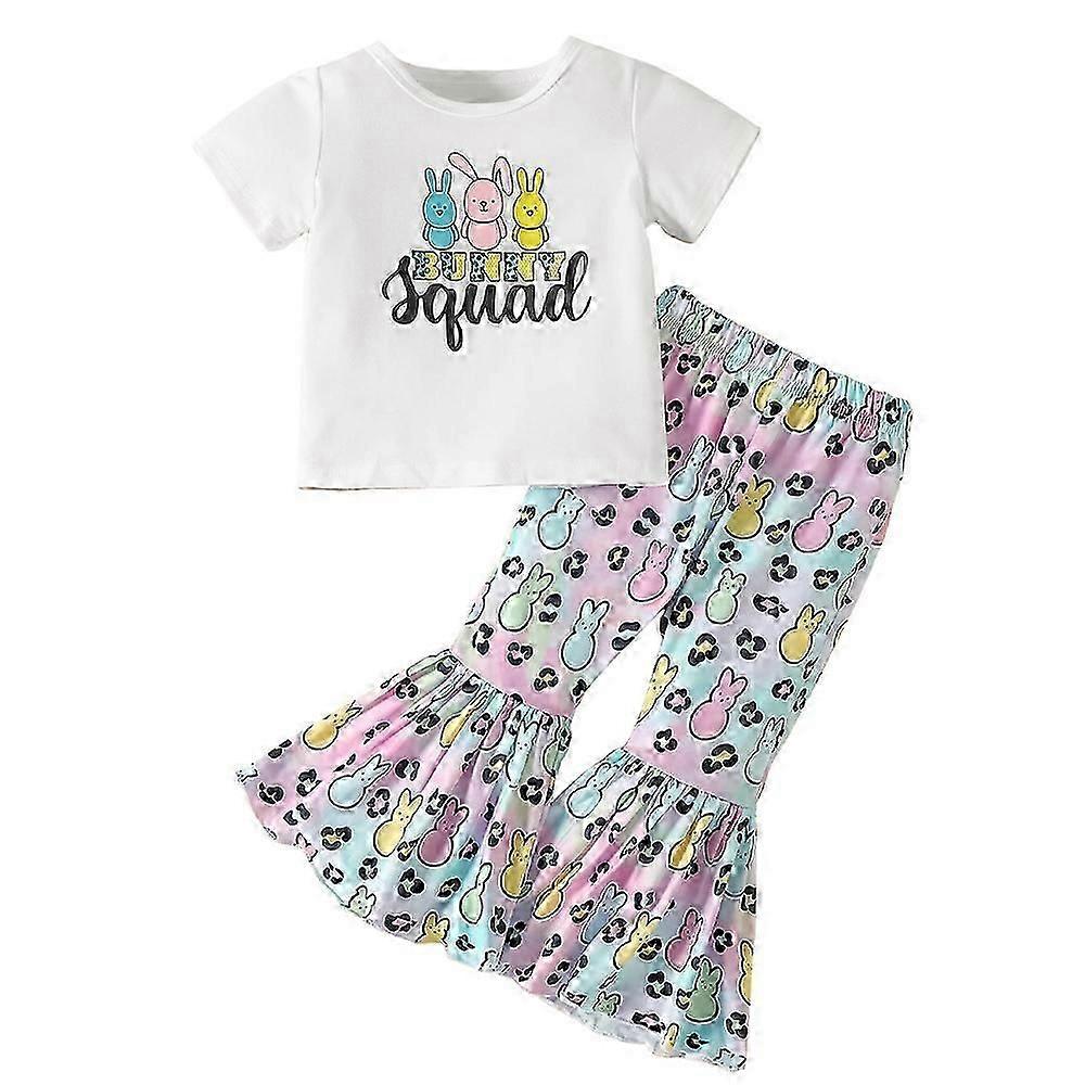 Easter Outfit Baby Kids Girls Cartoon Bunny Rabbit Print Short Sleeve T-Shirt Top Flared Pants Trousers Casual Suit Set