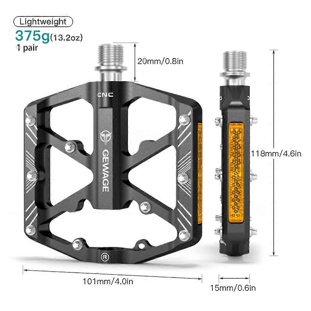 Bike Pedals Aluminum Alloy Bicycle Pedals with Reflectors Mountain Bike Pedals Non-Slip Cycle Pedals Platform Features: CNC aluminum alloy material guarantees a long-lasting durability.  3 sealed bearings keep spindles from water and dust. 9 anti-skid nails on each side holds your feet in place. Reflectors remain visible to increase riding safety in low light. Wider platform provides the foot larger surface area when riding. L for left pedal, R for right pedal, easy to install. Specifications: Material: Aluminum alloy Color: Black / Blue / Golden / Titanium / Red (optional) Size: 101 * 118 * 15mm / 4 * 4.6 * 0.6in Weight: 375g / 13.2oz Package List: 1 * Pair of Bike Pedals 1 * Set of Mounting Tools