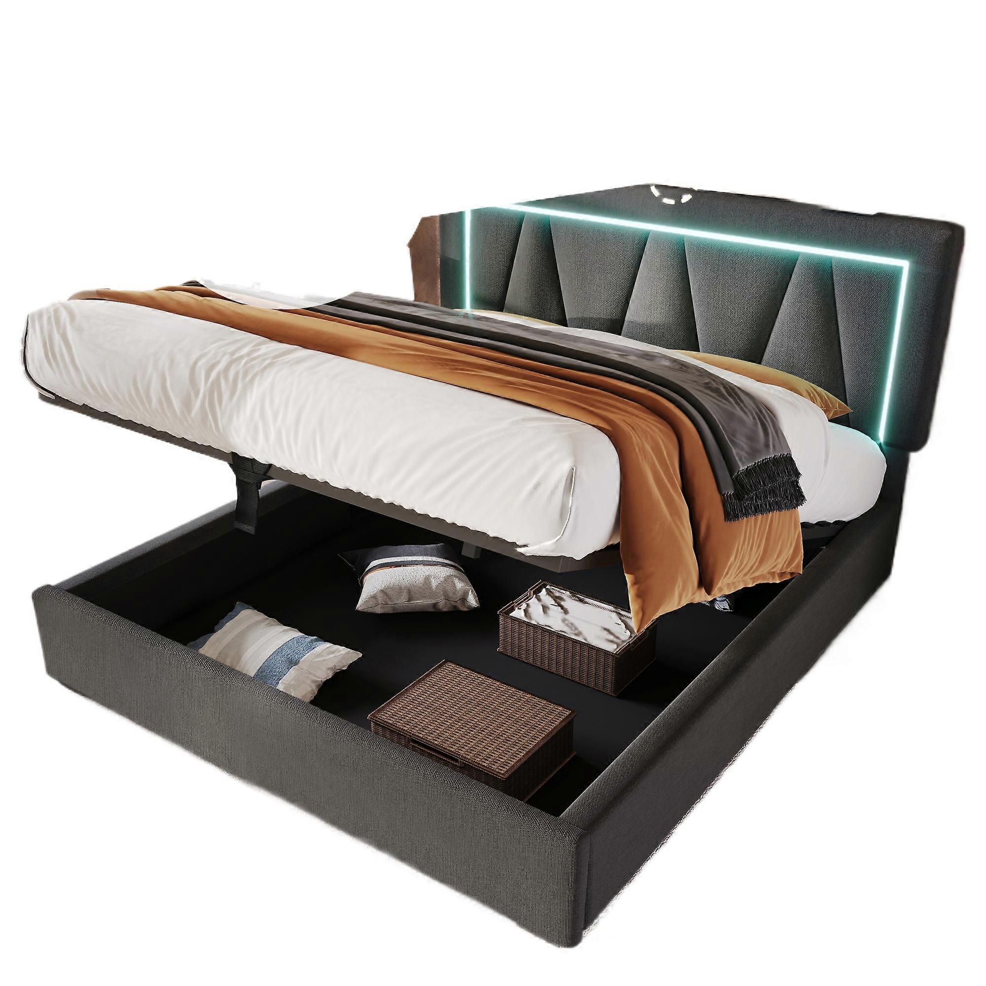Linen LED Double Bed 160x200cm USB-C Storage Slatted Base No Mattress