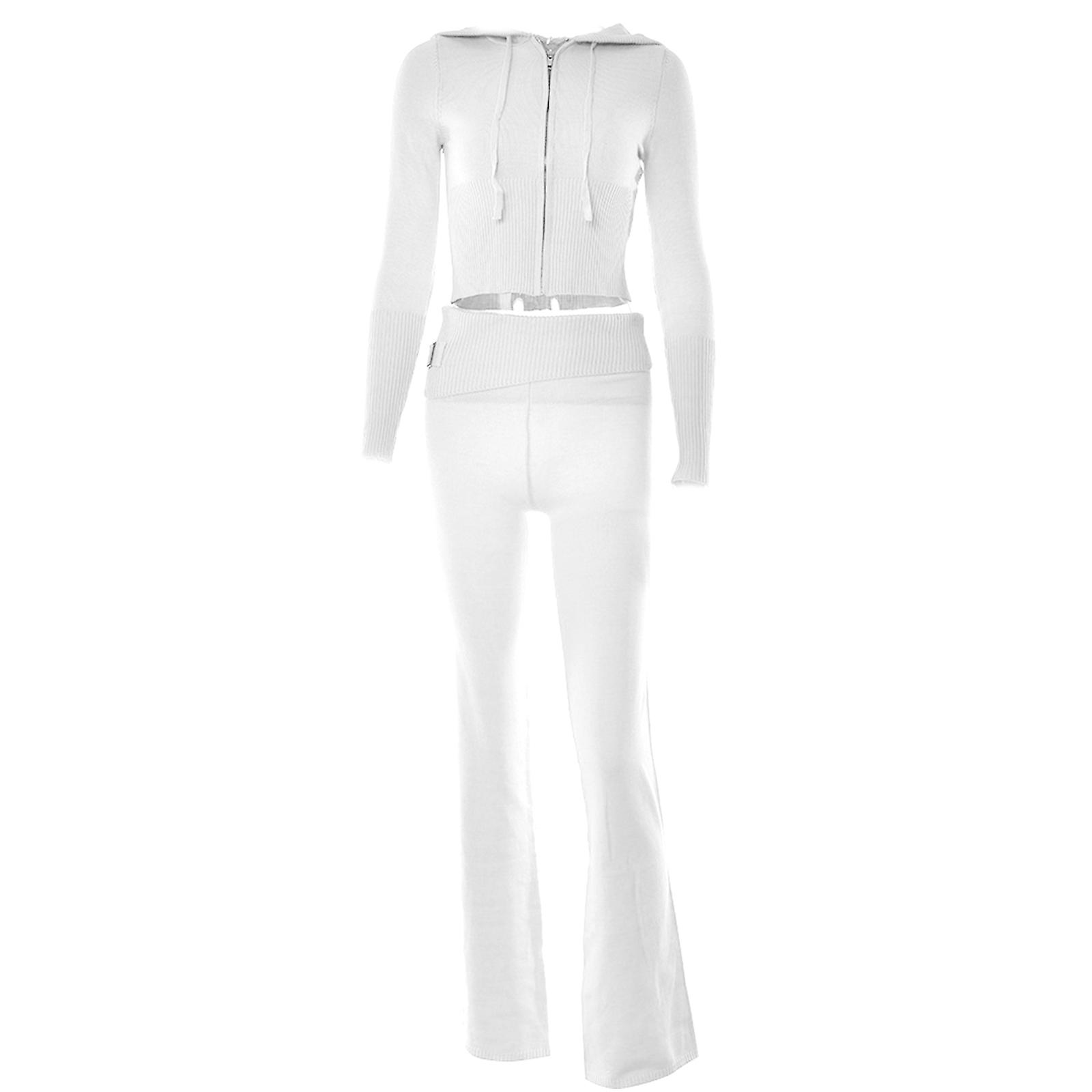 Knit Hooded Tracksuit for Women Hoodie Cropped Top and Pants Set Solid Color Knitted Long Shorts Suit Female Outfits White S