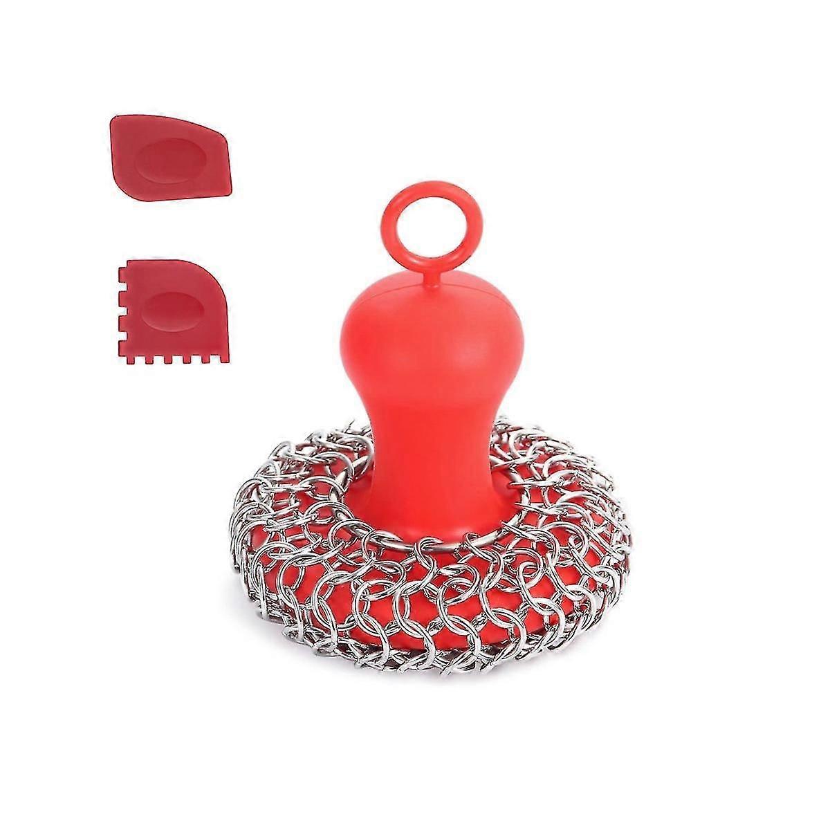 Cast Iron Chainmail Scrubber + Pan , Stainless Steel Skillet Cleaner, Tool For Cast Iron Pans Red
