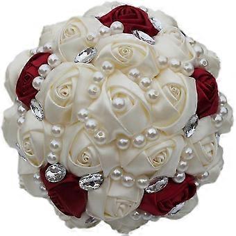 Romantic Wedding Bouquet Silk Flower Bride Holding Rose with Pearl Crystal Ribbon Valentine's Day (Ivory + Wine Red)
