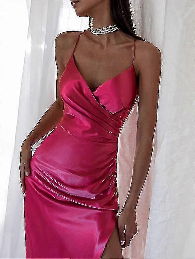 Champagne Sleeveless V-Neck Ruched Split Midi Satin Dress for Women - Spring & Summer Elegance