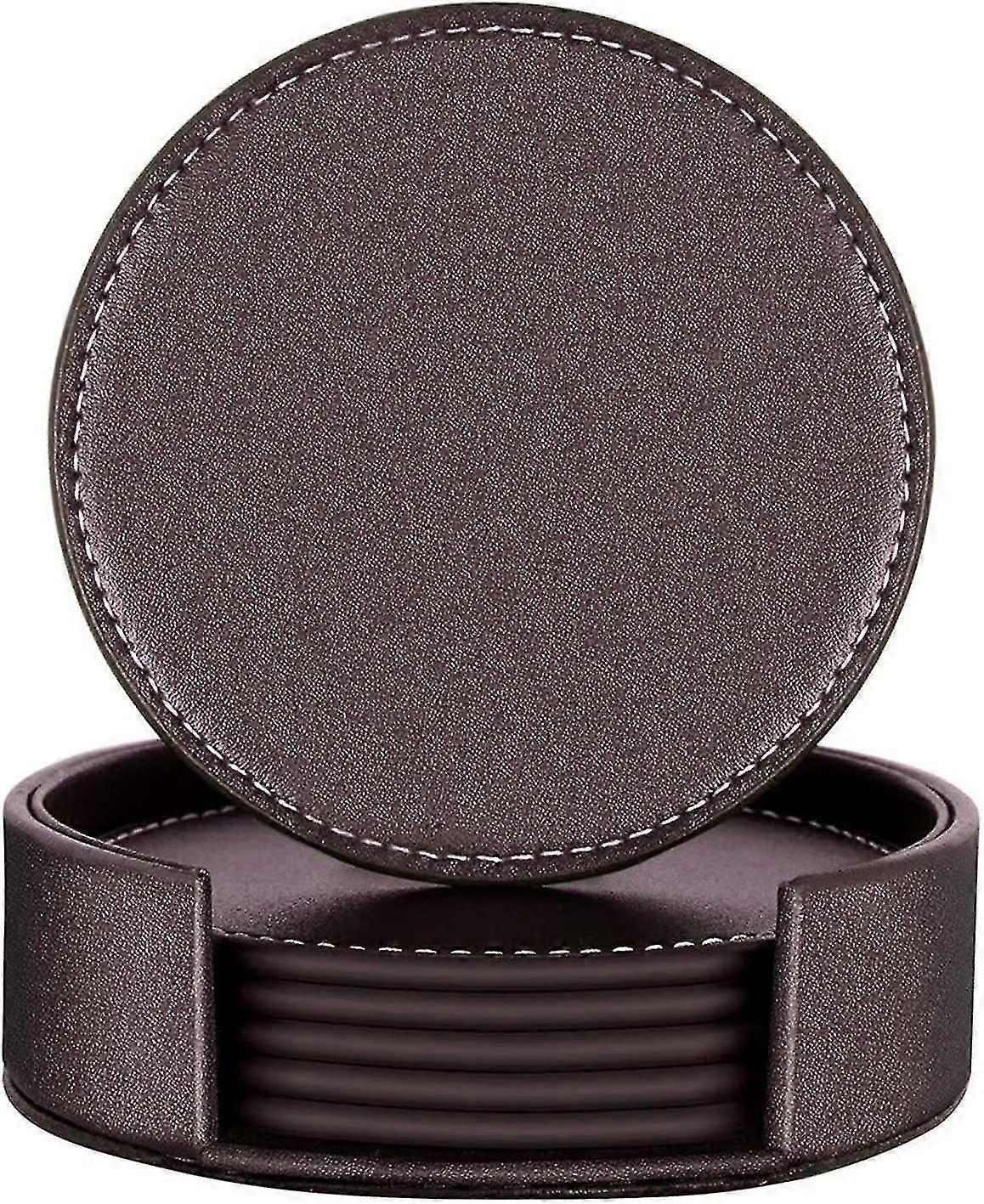 Set Of 6 Round Faux Leather Coasters With Drink Holder, Brown, Coaster