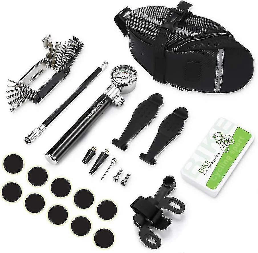 Product Description Package Contents: 1 set of screwdriver repair tools (16 pieces) 1. Upgrading the three-in-one tire lever + tape + three-in-one film function, our fish-shaped presser foot is larger, stronger, not easy to break, can be detached and installed on a more practical presser foot. It can be disassembled and stored when not in use, and can accommodate 10 tire patches for easy transportation. 2. All copper tire pressure gauge pumps tire pressure up to 210 PSI with an accuracy of 2.5. Make sure your tires are still in good condition. Keep your tires inflated to the correct pressure to prevent sudden drops in tire pressure that can cause rashes. 3. Multifunctional riding tool kit 16-in-1 repair screwdriver solves most problems 8/10/15mm adjustable wrench, Phillips head screwdriver, 8/9/10mm socket wrench, socket extension, flat head screwdriver, Allen wrench 2/2.5 /3/4/5 /6 mm. 4. Small hand pump, compatible with different nozzles: Comes with compact pump and accessories; a ball adapter and 2 air nozzles for swim buoys and other inflatable objects. 5. Portable Bike Tire Repair Kit All accessories come in a saddle bag that fits under your seat and has a mesh pocket to carry your phone; an ATV mounting bracket is also included.