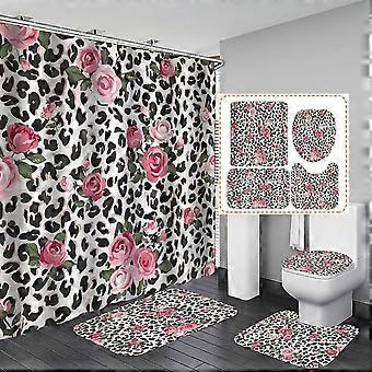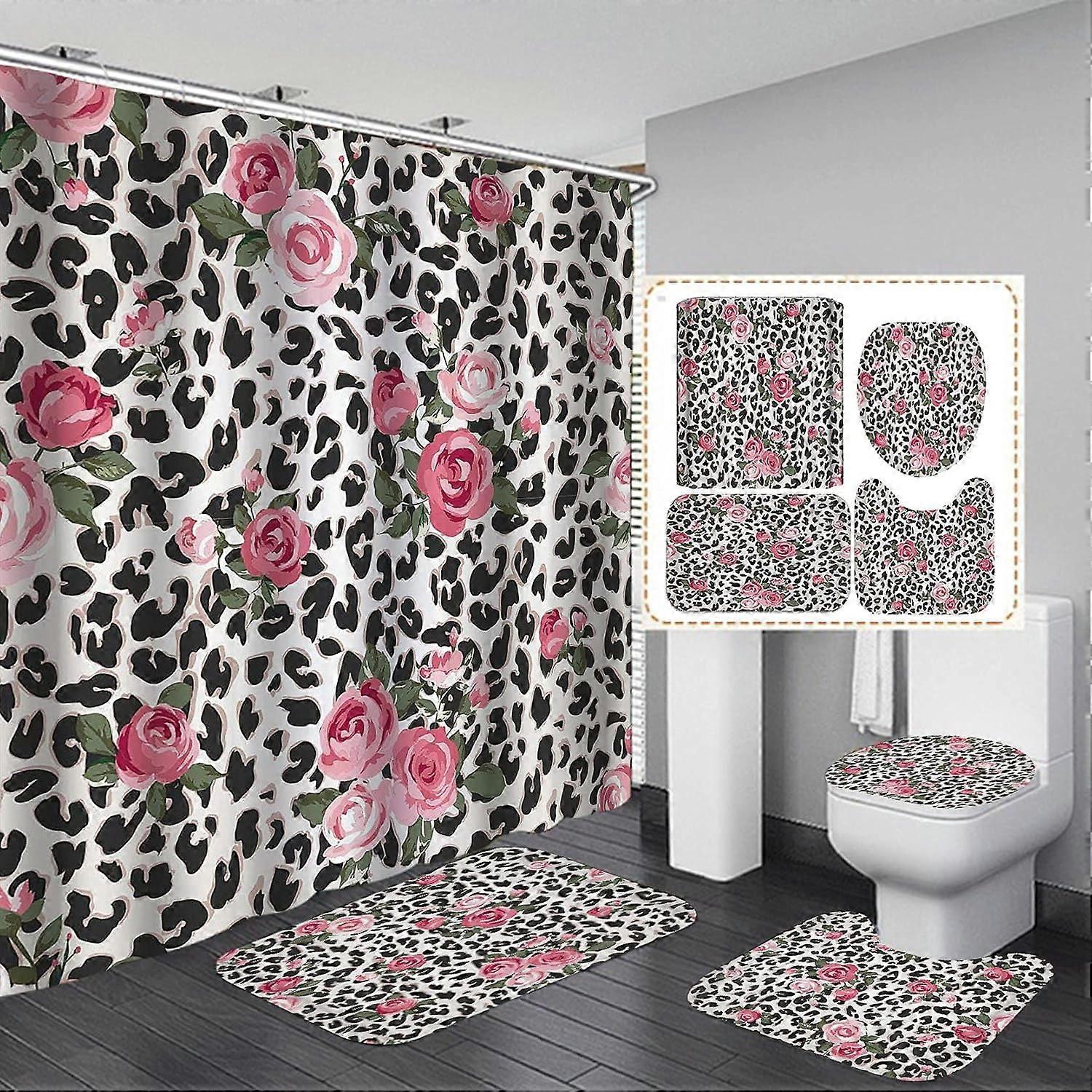 4PCS Leopard Print Shower Curtain Set with Motivational Quotes, Brown Cheetah African Wildlife Safari Animal Skin Design, Non-Slip Bath Mat for
