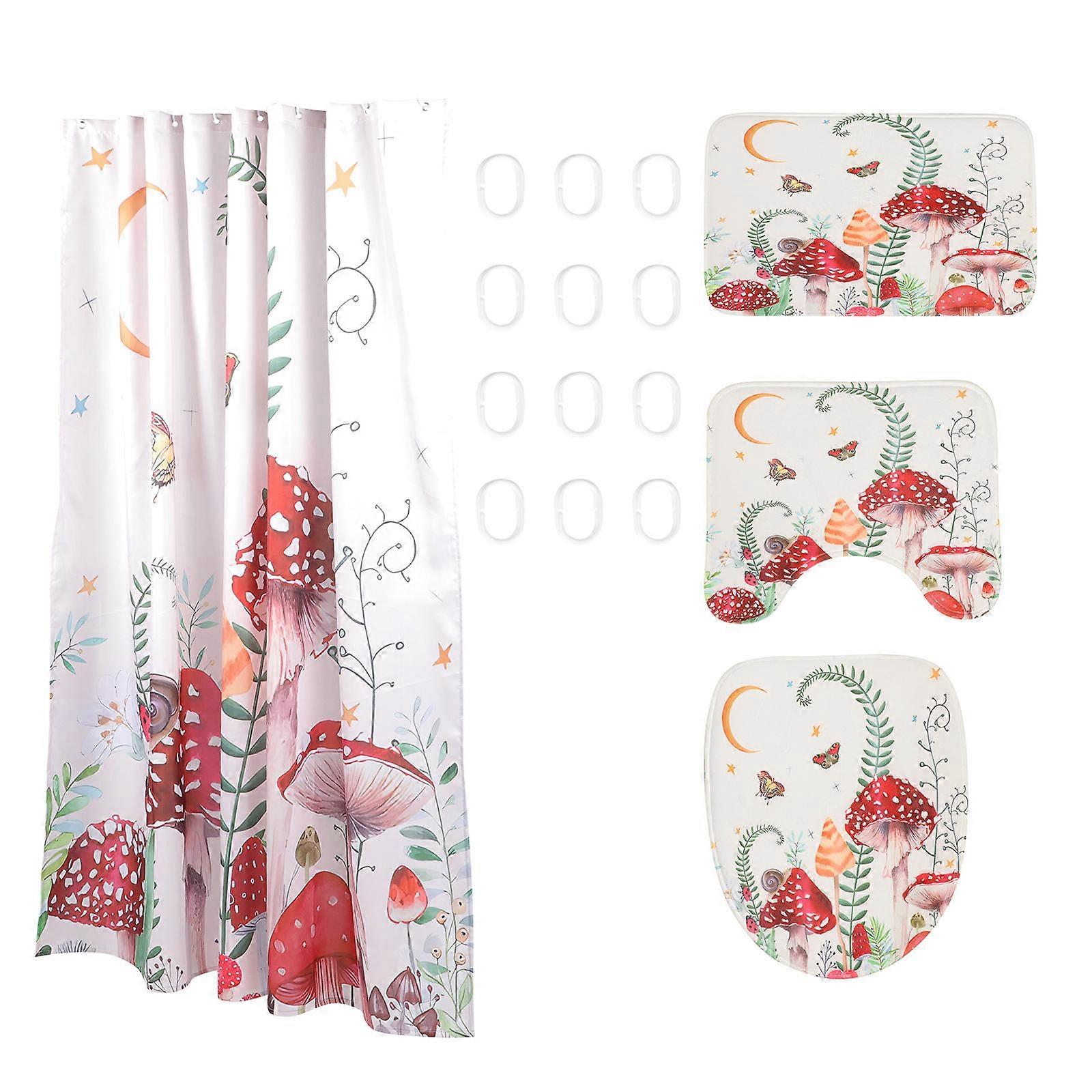 Mushroom Themed Shower Curtain Set For Bathroom Decor Family Shower Anti-Slip Quick Dry 180x180cm 1Set