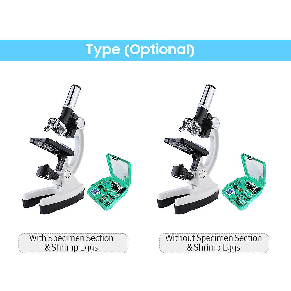 Features:  [ LARGE RANGE OF MAGNIFICATION ]--- WF10X eyepieces plus 10X, 60X, 120X objective lens, with overall 100X-1200X magnification, wide range magnifying times for clear observing.  [ PREMIUM METAL FOR DURABLE USING ]--- This microscope is made of high class metal, which is durable and make it a beautiful thing.  [ PRACTICAL WIDE APPLICATIONS TOOL ]--- Powerful multi-purpose compound microscope for viewing tiny details of specimen slides.  [ GREAT FOR AMATEURS & PROFESSIONALS ]--- Develop children and students interests, see a micro-world, find the infinite fun from it.  [ SUITABLE FOR CHILDREN & ADULTS]--- Satisfy you little budding scientists' curiosity, open their horizon, find a brand new world, have great fun in spare time.  [ COMES WITH ABUNDANT ACCESSORIES ]--- With these accessories, you little scientists will get much fun from it, to discover an amazing world.    Specifications:  Color: White + black  Material: ABS  Optical system: Refraction  Light resource: Bottom light  Power for light: 2 * 1.5V AA batteries(NOT included)  Eyepieces magnification: WF10X  Objective lens magnification: 10X, 60X, 120X  Total magnification: 100X-600X-1200X  Item size: 24 * 13.2 * 8cm / 9.45 * 5.20 * 3.15in  Package weight: 1800g / 63.49oz  Package size: 38 * 35 * 10.5cm / 14.96 * 13.78 * 4.13in    Package list:  1 * Microscope  1 * Brooding box  1 * Culture dish  1 * Glue  1 * Tweezer  1 * Coloring agent  1 * Micro slicer  5 * Specimen section  7 * Blank section  1 * Cover slide  1 * Stirring rod  1 * Stirring needle  1 * Dissection knife  1 * Sea salt  1 * Shrimp eggs  2 * Small test tube  1 * Long test tube  1 * Carry box    Note:  1. The AA batteries for microscope light are not included.  2. The color of carry box is randomly delivered.
