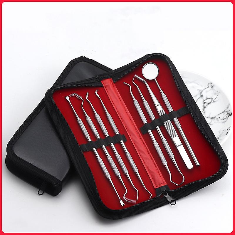 TARTAR REMOVER & FRESHEN AREATH: If you can't remove stubborn plaque and tartar from your teeth with a toothbrush, this stainless steel toothpick is the perfect solution. You can use the dental tools included in the tooth cleaning tools to remove stubborn stains, Removing plague, tartar, bacteria and debris from teeth and gums. Teeth whitening and fresh breath will make you smile with confidencePROFESSIONAL 8-IN-1 ORAL CARE KIT: Includes 1 hammer-shaped needle, 1 sawtooth needle, 1 sharp needle, 1 sickle tartar remover, 1 tweezers, 1 tooth probe, 1 detail mirror and 1 hoe tartar remover, especially for professional dentists and personal use . All dental scrapers are made of high strength. This rustproof oral care kit is strong and sharp enough to remove plaque and tartar from between teethERGONOMIC & POWERFUL: Developed in different angles and shapes, the professional stainless steel tooth scraper is perfect for different tooth sides. It is suitable for removing tartar, disease residues and bacteria, for breathing, for bleaching teeth and for observation see areasALSO USE ON PETS: Not only is this professional tooth scraper kit used for personal hygiene, it can also be used to keep your pet's teeth clean and refreshing. Get closer to your dog and cat.ZIPPED POCKET FOR EASY STORAGE: Comes in a sturdy zippered pouch to keep your toothpick set clean and tidy while traveling. And protect your tools from scratchesYou can also use it as a daily mouth care tool without hurting the gums and easy to use.1. Tweezers: Remove the food particles from between your teeth. This dental instrument is easier to use than an ordinary bamboo toothpick.2nd probe: probe dentures replace the normal toothpick, cleaner and more hygienic.3. Sickle scaler: Scrape off the possible subgingival calculus and each side of the tooth. The stainless steel dental set can also penetrate the periodontal pocket.4. Hoe Tooth Scraper: Use Hoe Tooth Cleaner to scrape off the pigment, mouth stain, and tartar from the sides of the teeth.5. Hammer Needle: These hammer needle dental care tools test and fix the looseness of the tooth during tooth restoration.6. Tooth mirror: You can use dental mirror to check tooth decay, and better observe the place where ordinary mirror is invisible and easy to use.7. Tap needle: for tapping teeth and better for dental implants. You can use this toothpick to fill the bone powder in.8. Saw tooth needle: Scrape the stubborn mouth stain on the tooth surface effectively with the inside